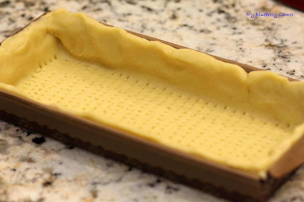 Podzielić na 3 równe części, każdą rozwałkować na prostokąt (ciut większy niż foremka), przenieść do foremek i wykleić dno i ścianki (dna ponakłuwać widelcem).
