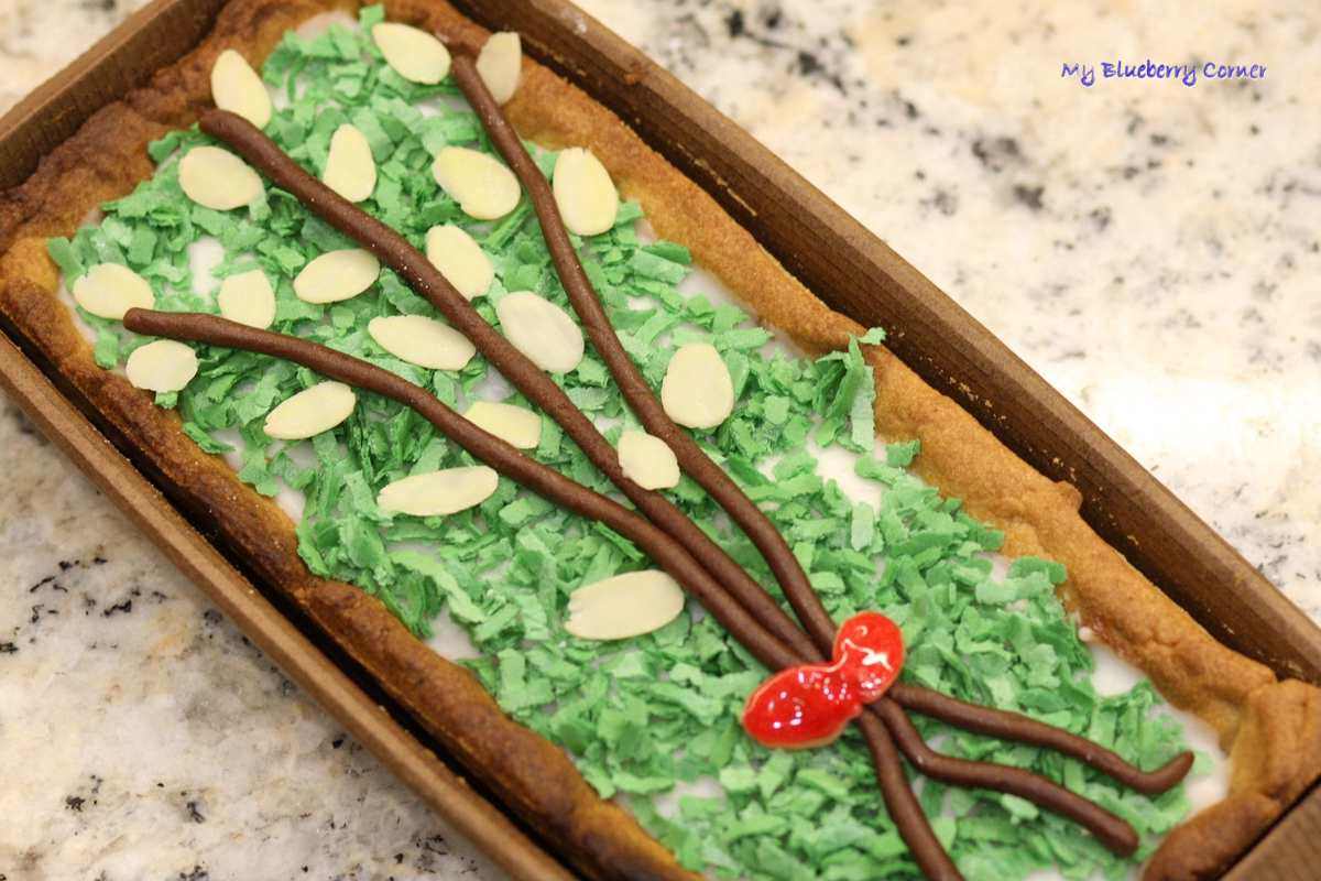 Moje dekorowałam zielonymi waflowymi ścinkami – trawa, ugniecionym marcepanem z kakao – gałązki, płatki migdałowe – bazie, marcepan i gotowe, kolorowe, lukrowe pisaki.