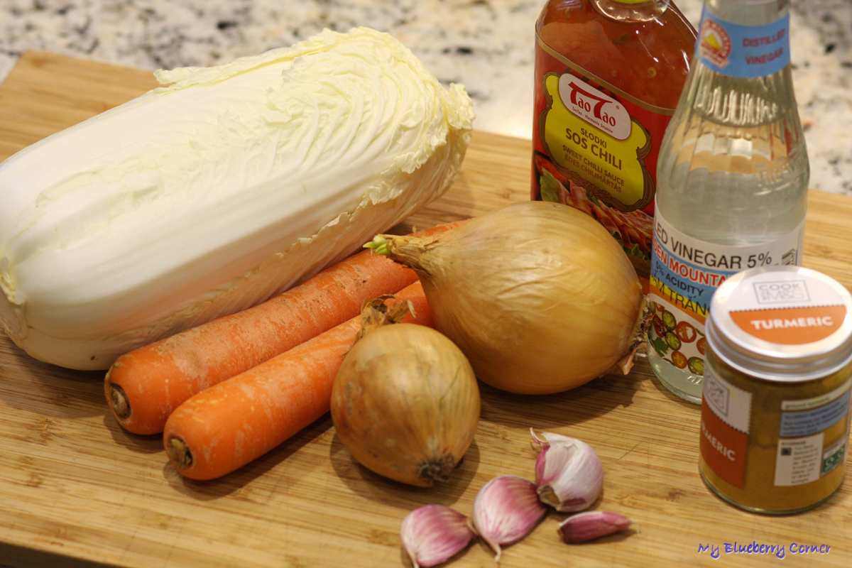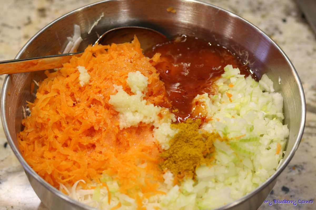 Dodać cebulę, startą na tarce o grubych oczkach marchewkę i wyciśnięty przez praskę czosnek. Doprawić solą, cukrem, dodać ocet, kurkumę i słodki sos chili.
