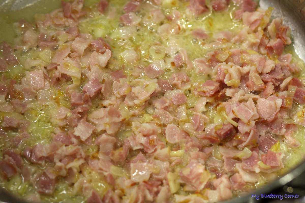 Cebule i czosnek obrać i posiekać. W sporym garnku rozgrzać oliwę z łyżką masła, na tym podsmażyć cebulę i czosnek. Boczek pokroić w drobną kostkę i dodać do cebuli, zrumienić.
