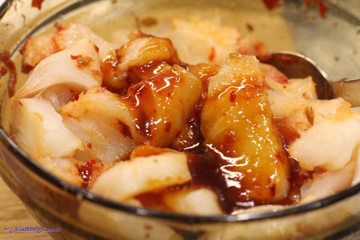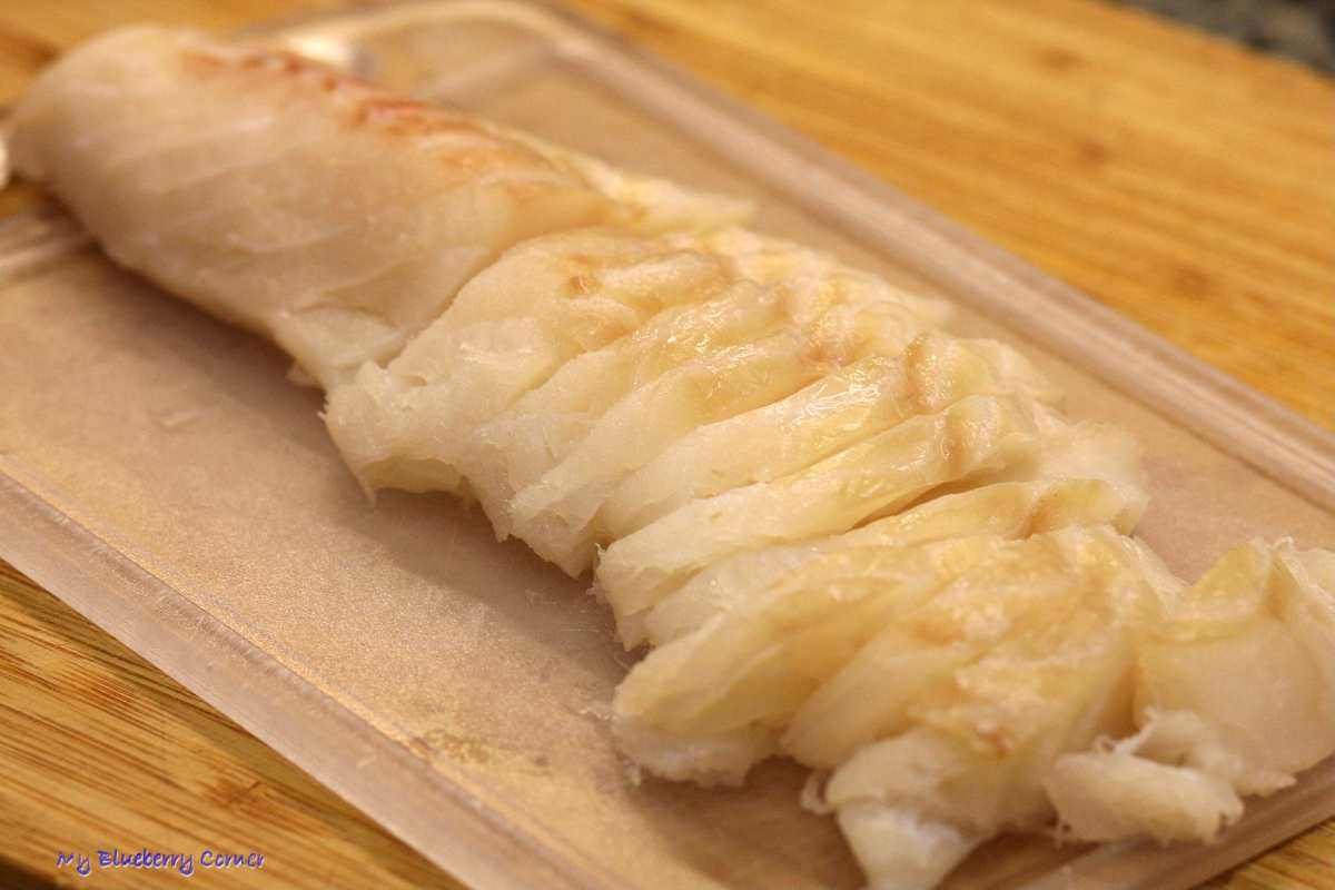 Rybę pokroić w cienkie plastry, dodać oba sosy i odstawić do zamarynowania na ok. 30 minut.