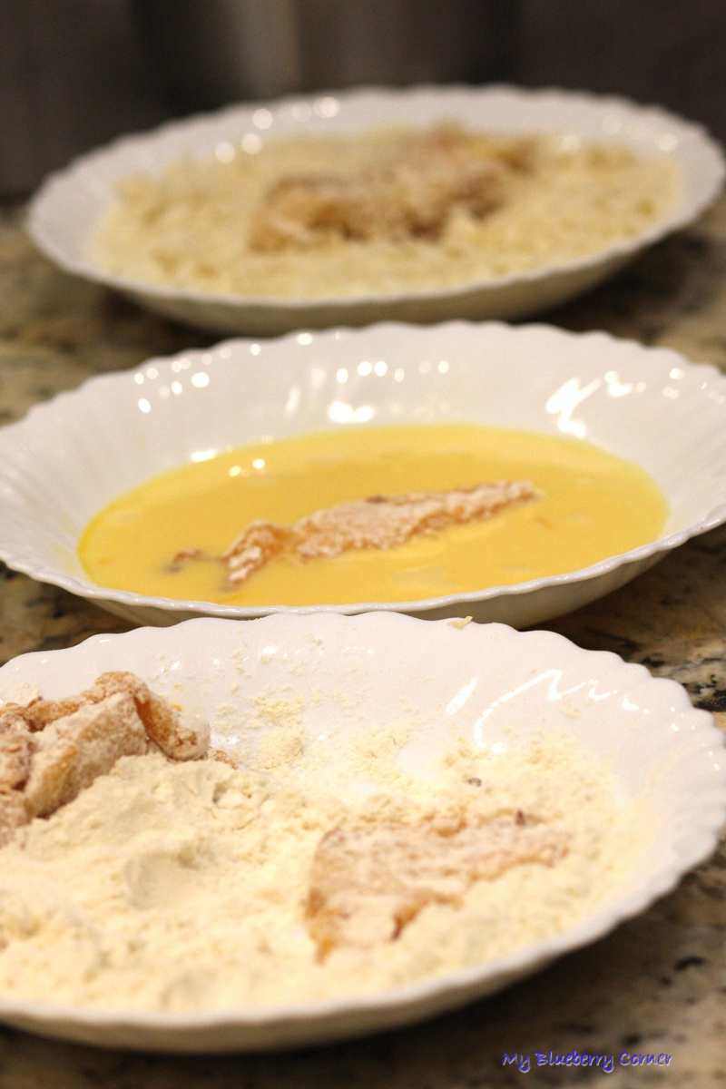 Przygotować trzy głębokie talerze. Do jednego wsypać mąkę, do drugiego wbić jajko, dolać mleko i wymieszać widelcem, do trzeciego wsypać panierkę panko.