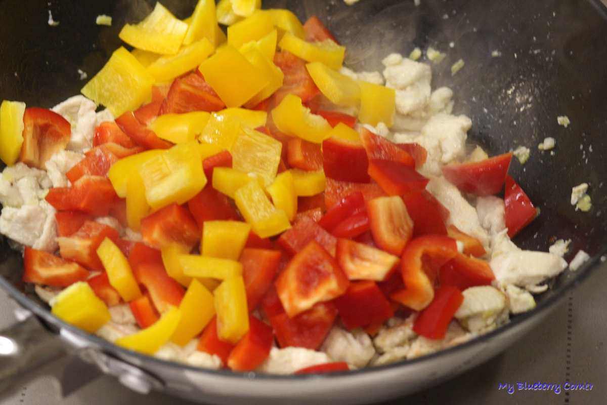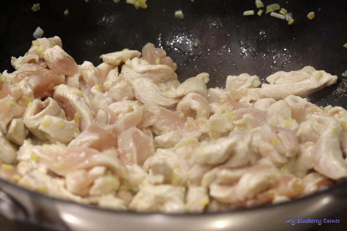 Kurczaka pokroić w cienkie paski. Czosnek i imbir obrać i drobno pokroić. Papryki oczyścić z nasion i pokroić na kwadraty 3–4 cm. W woku rozgrzać olej i podsmażyć przez minutę czosnek z imbirem. Dodać kurczaka i smażyć, aż się delikatnie zrumieni.