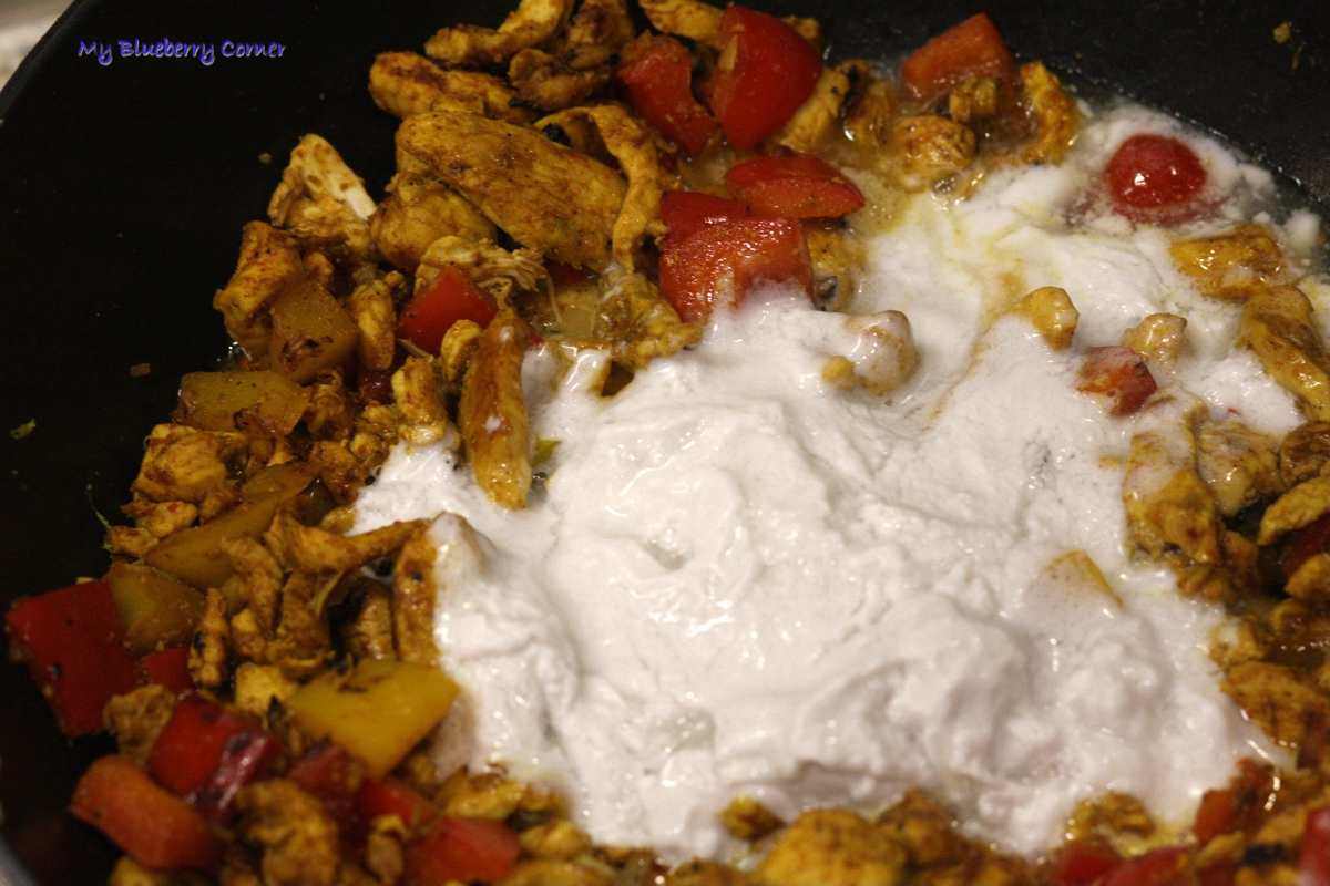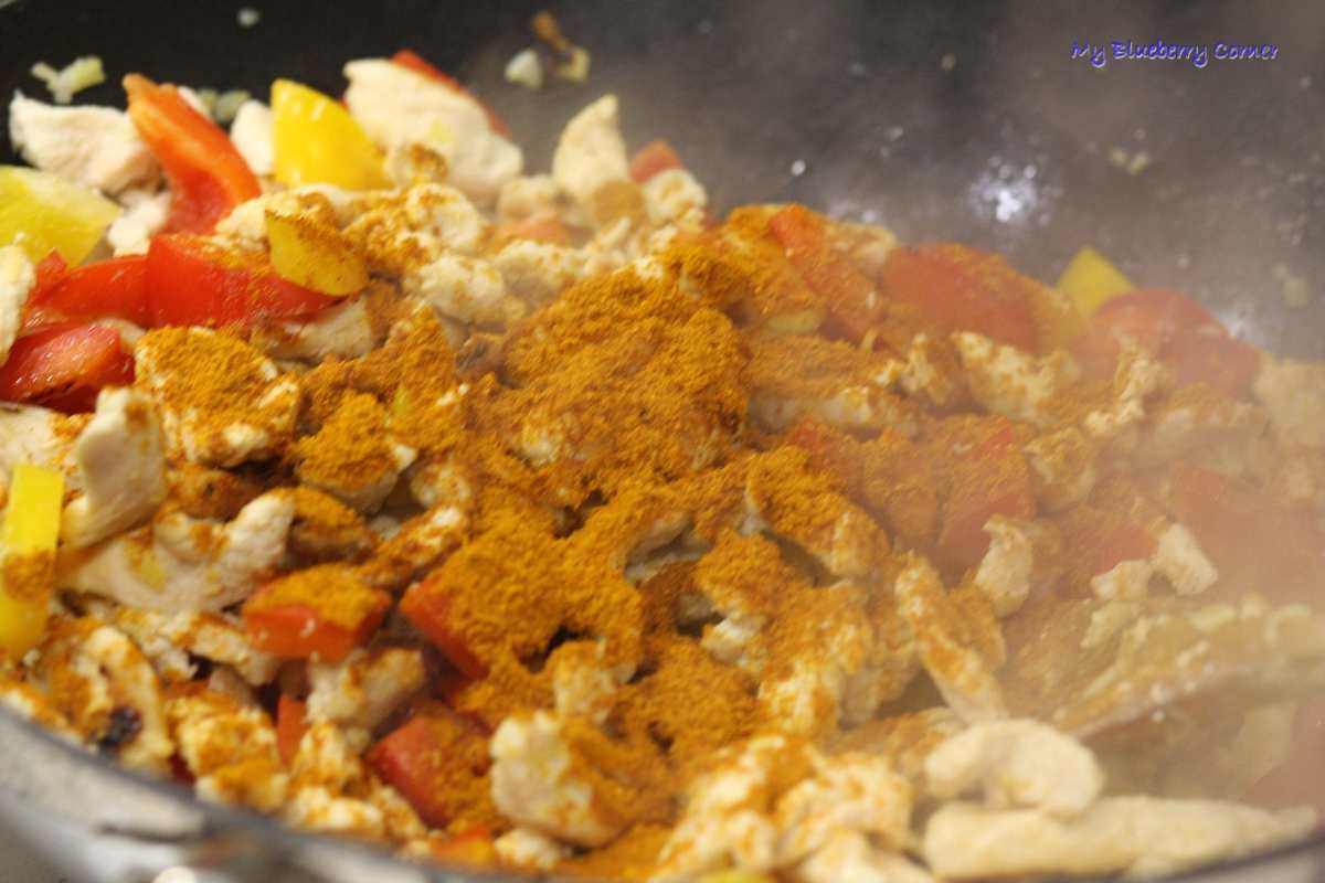 Po dwóch minutach dodać startą skórkę z limonki, kurkumę, drobno posiekaną papryczkę chili, mleczko kokosowe, sos sojowy, rybny i ocet ryżowy.
