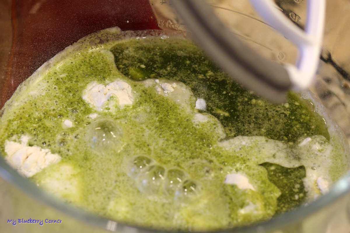 W misce wymieszać mąkę, mleko kokosowe, jajka, sól, pozostałą wodę oraz płynne zioła, aż powstanie gładkie ciasto.