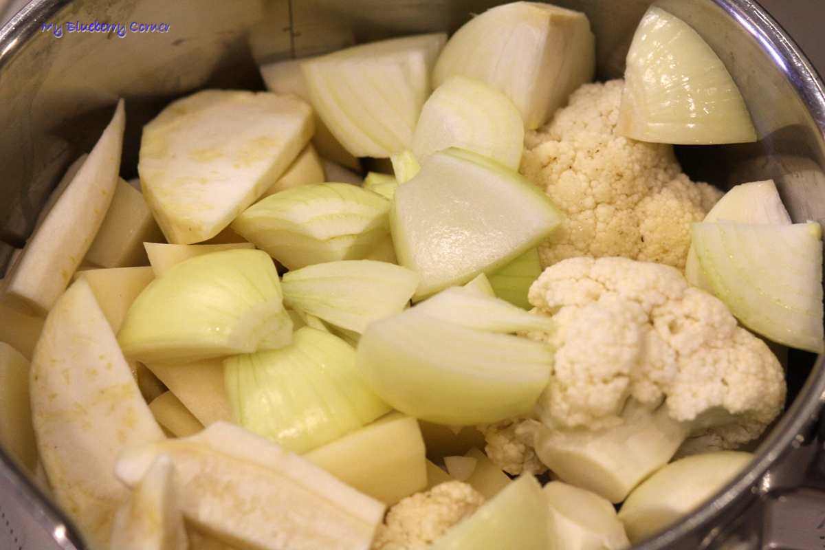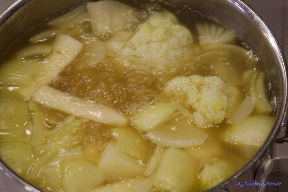 Zalać bulionem i gotować ok. 45 minut, aż wszystkie warzywa zmiękną.