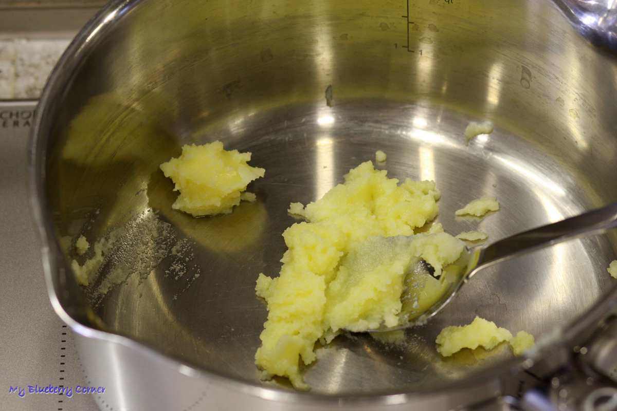 W rondlu rozgrzać masło i zrumienić na nim posiekaną drobno cebulę.