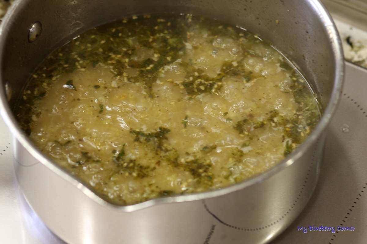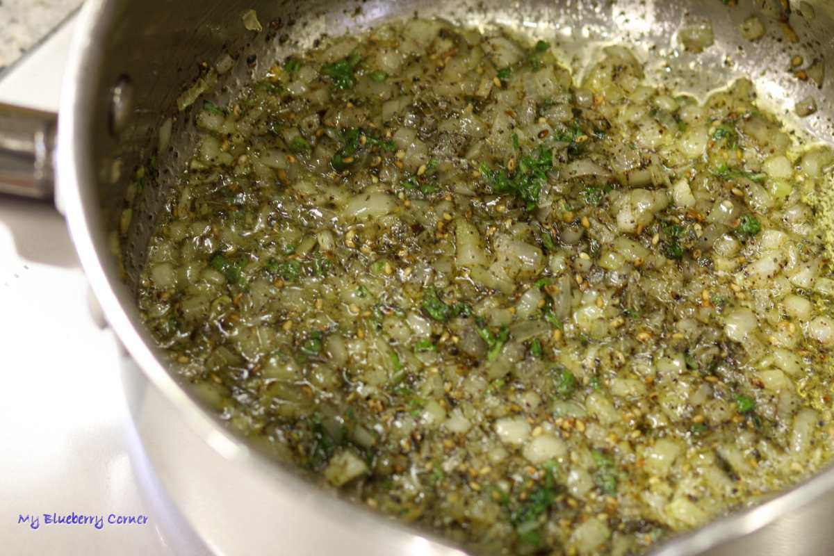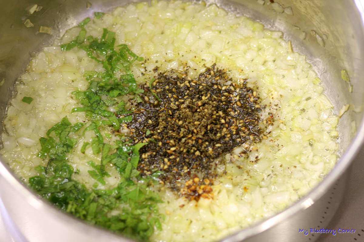 Dodać za’atar, sól, chili i posiekane liście szałwii, przesmażyć przez 1 minutę.