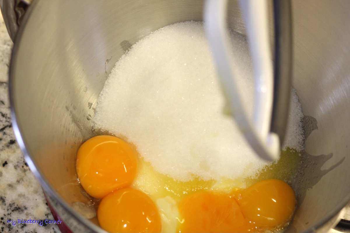 Piekarnik rozgrzać do temperatury 180 °C (termoobieg). Żółtka utrzeć z cukrem i masłem.