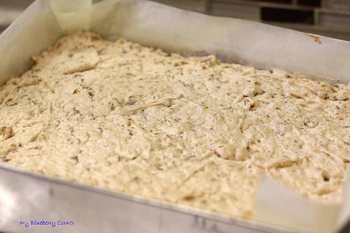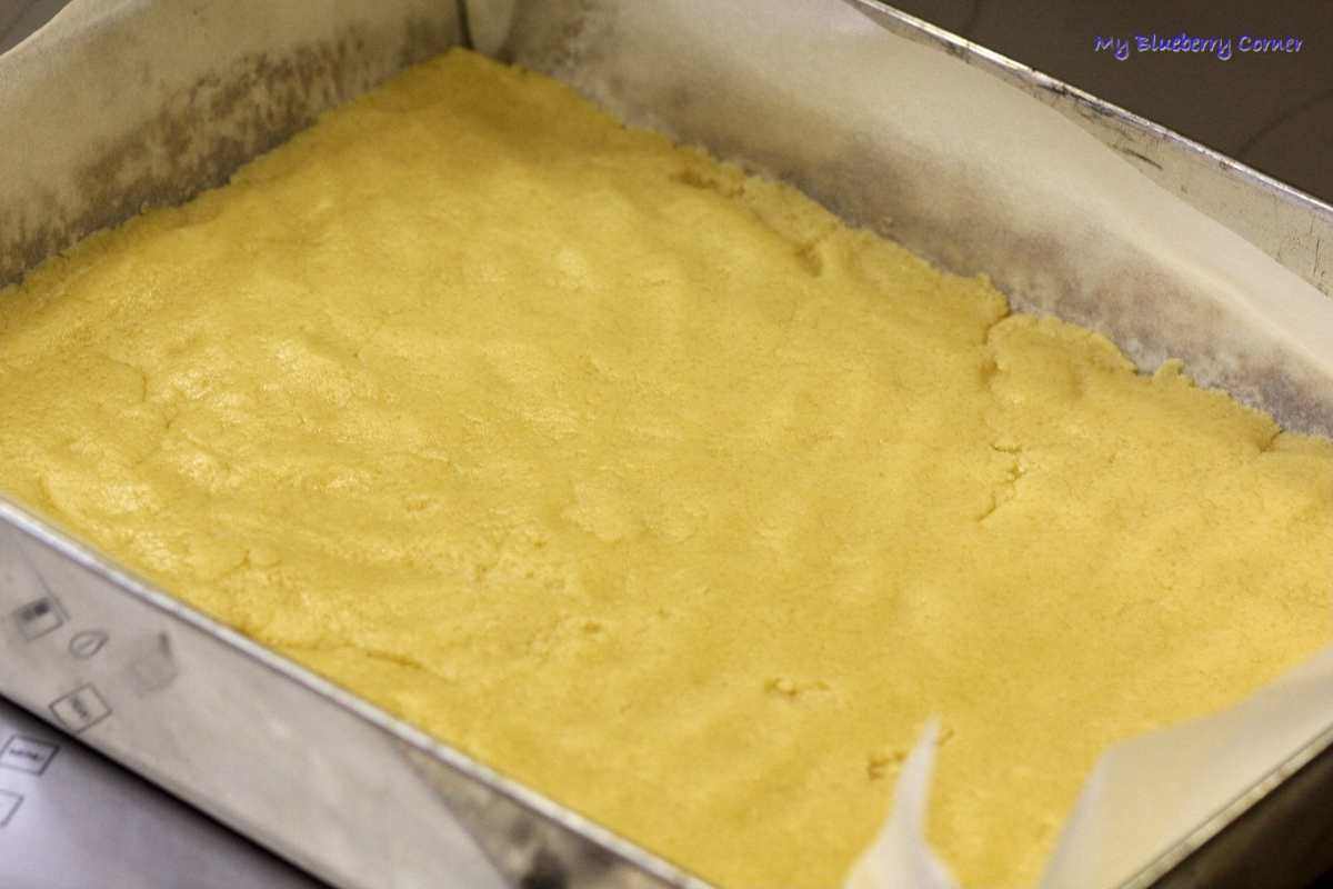 Dno (wyłożonej papierem blachy) wykleić przygotowanym ciastem.