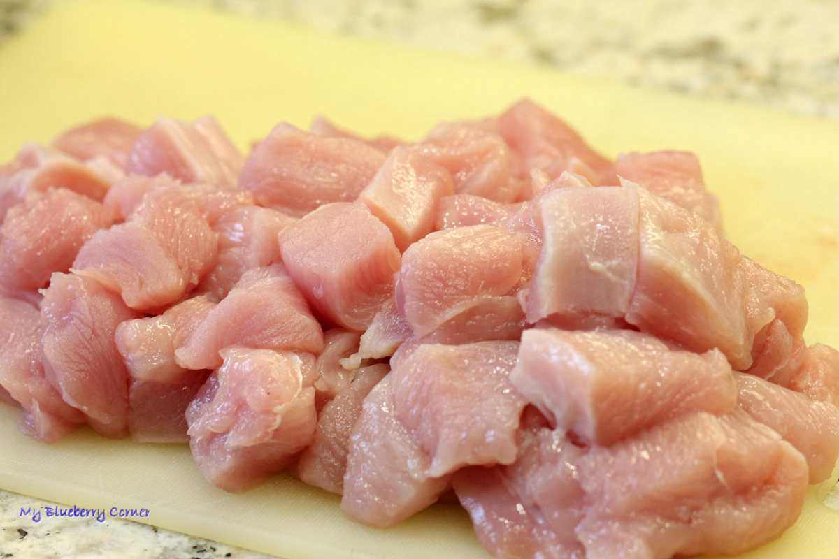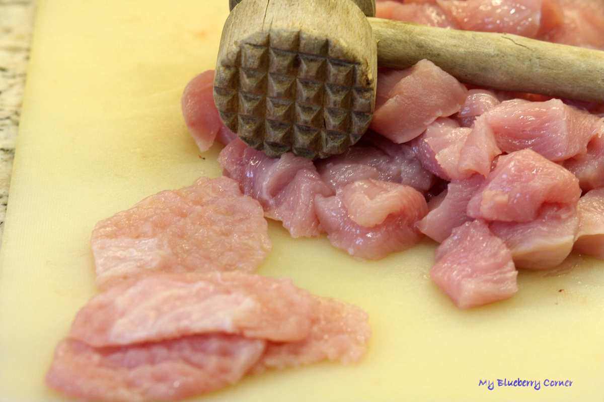 Pierś pokroić w grubą kostkę i każdy kawałek rozklepać lekko tłuczkiem lub wszystkie kawałki lekko posiekać w malakserze.