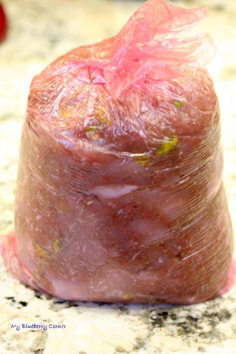 W torebkę foliową odpowiedniej wielkości włożyć mięsną masę (uważając żeby nie zamknąć wewnątrz mięsa powietrza) i zawiązać.