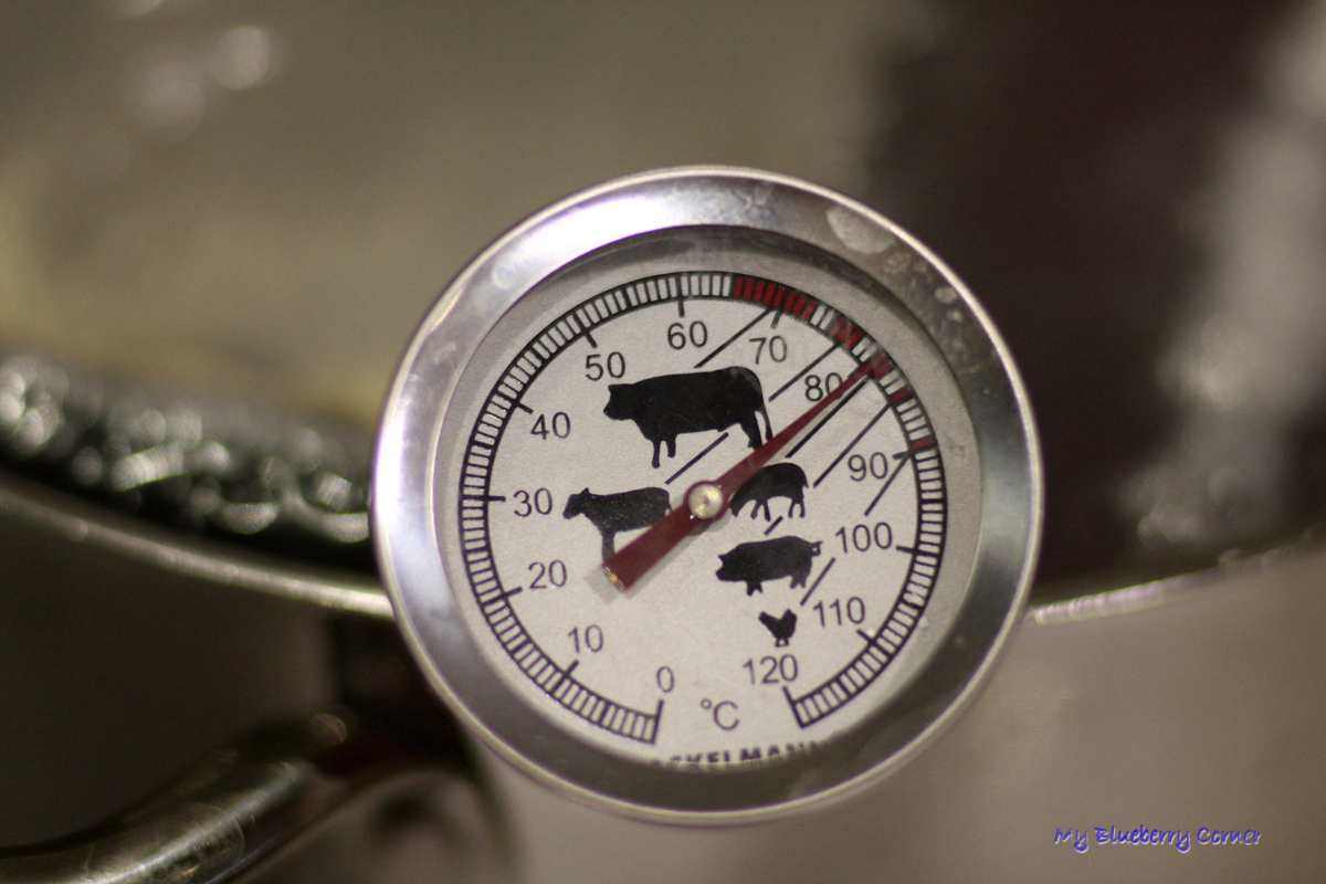 Parzyć w odpowiedniej wielkości garnku (szynkowar musi być zanurzony w wodzie) przez 1 godzinę i 20 minut, stale utrzymując temperaturę 80°C.