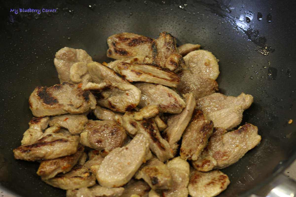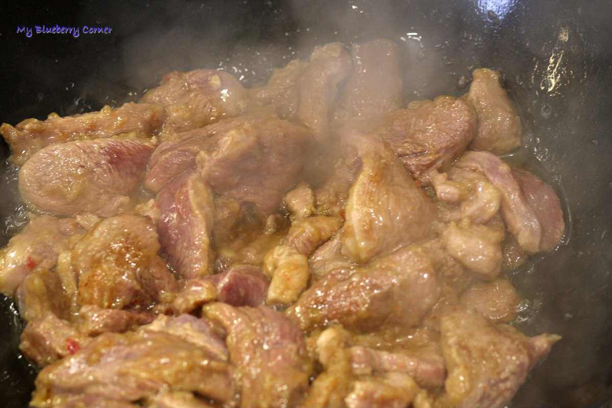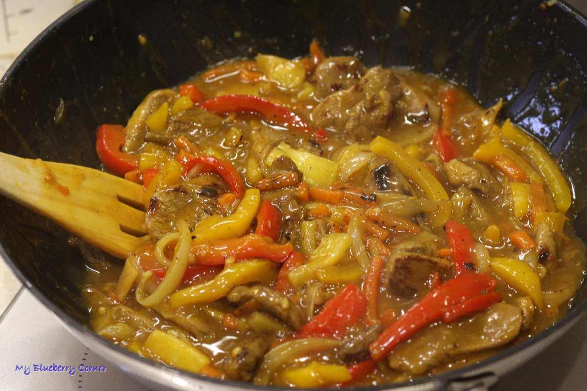 Wszystko wymieszać, dodać kawałki kaczki i podgrzewać jeszcze przez 5 minut. Skrobię kukurydzianą wymieszać z ½ szklanki wody, wlać do woka, zamieszać aż powstanie dość gęsty sos.