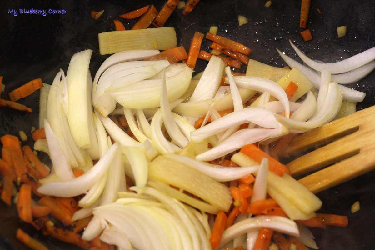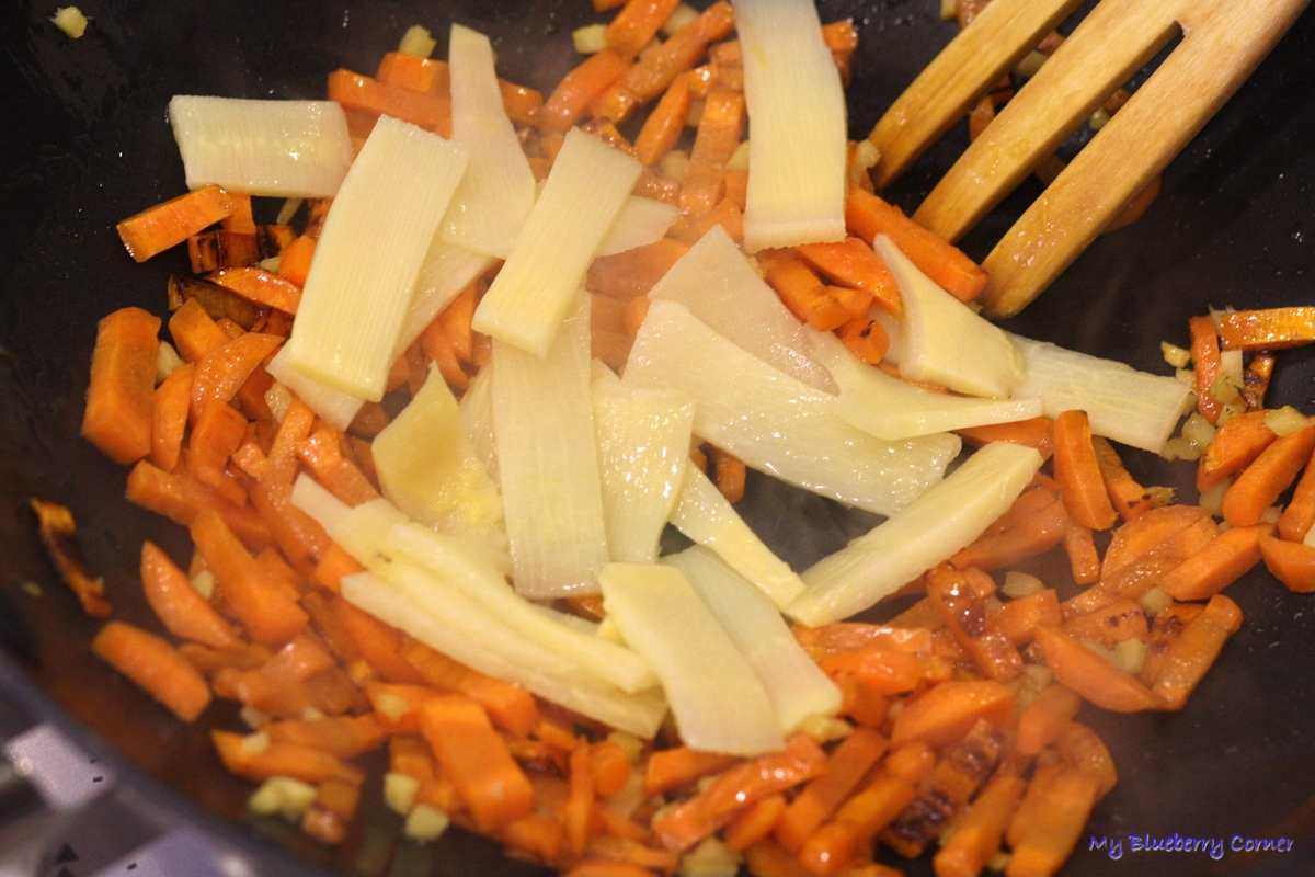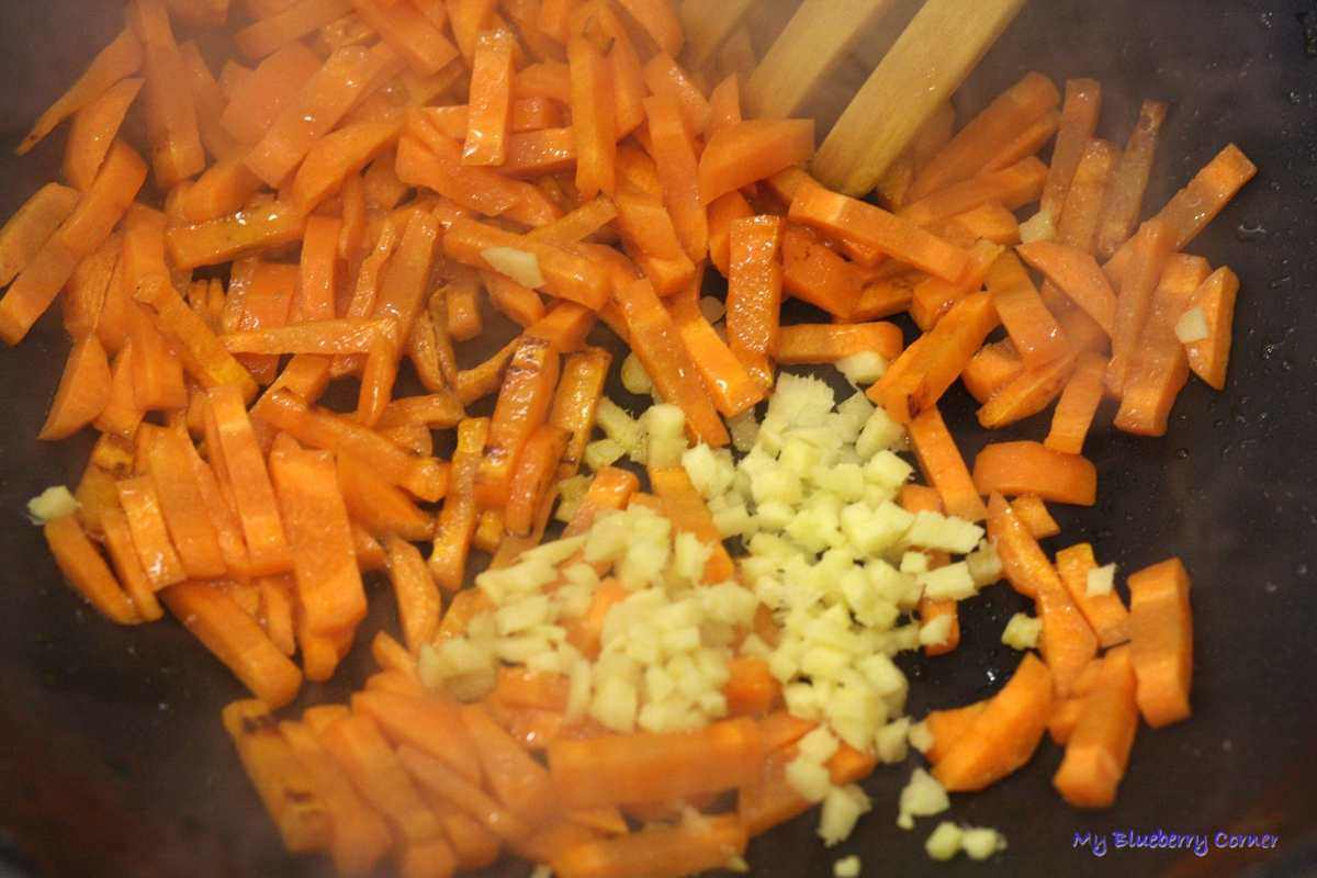 Kawałki kaczki wyjąć na talerz. Do woka dolać pozostały olej, podsmażyć marchewkę przez minutkę, dodać imbir i czosnek.
