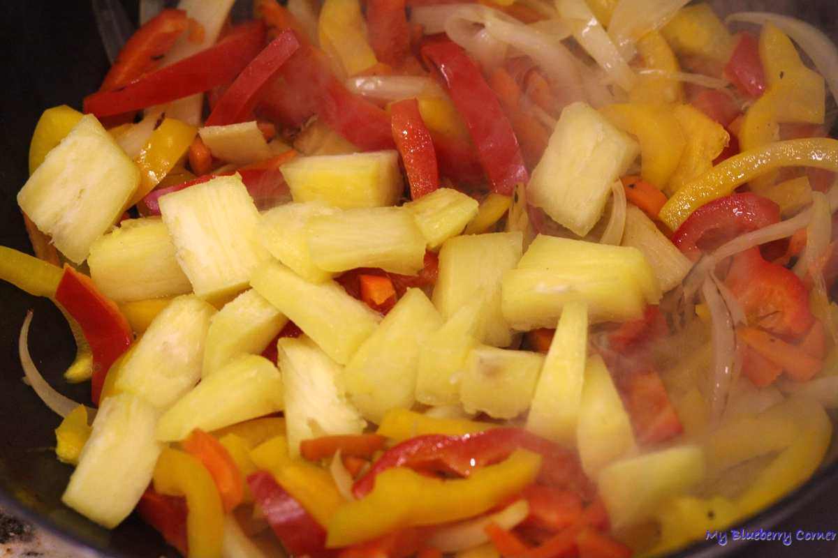 Po kolejnej minucie dodać pędy bambusa, cebulę, obydwie papryki i ananasa.
