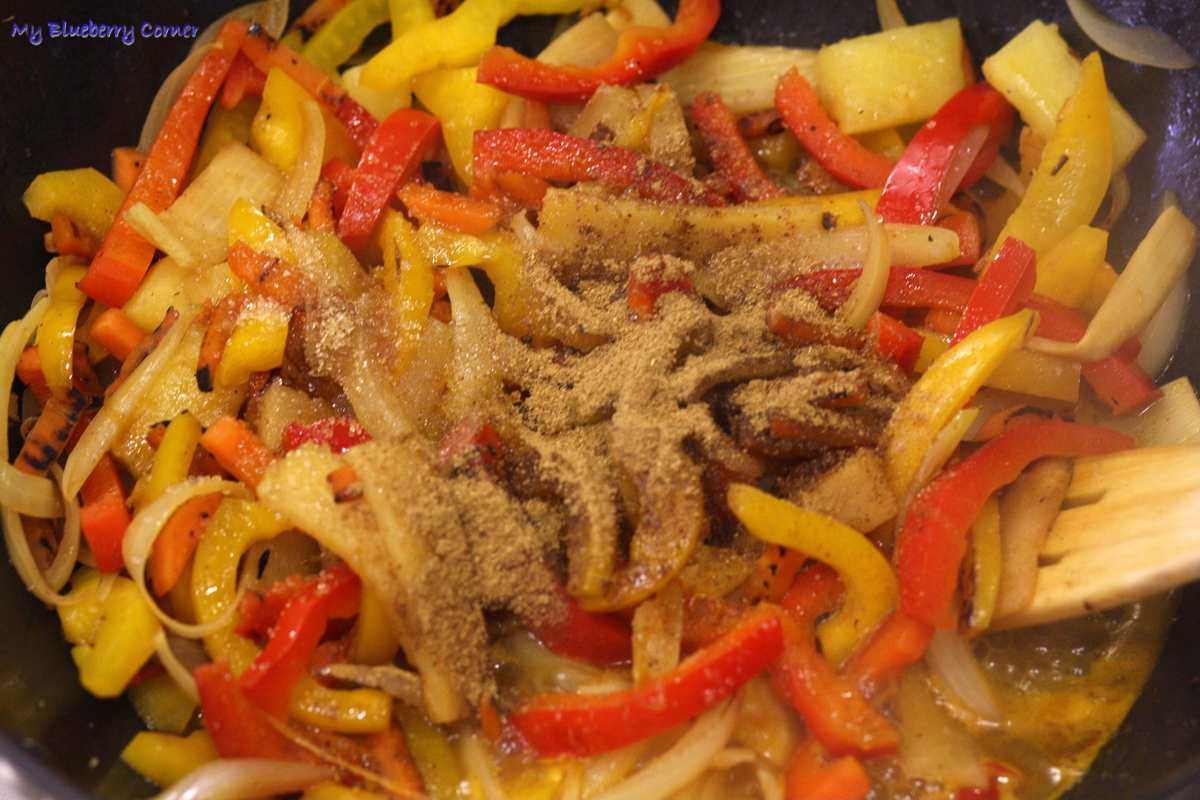 Smażyć 3 minuty. Wycisnąć sok z pomarańczy i połówki cytryny i dodać do warzyw. Przyprawić cukrem i przyprawą 5 smaków, dodać sos sojowy i pikantną pastę.
