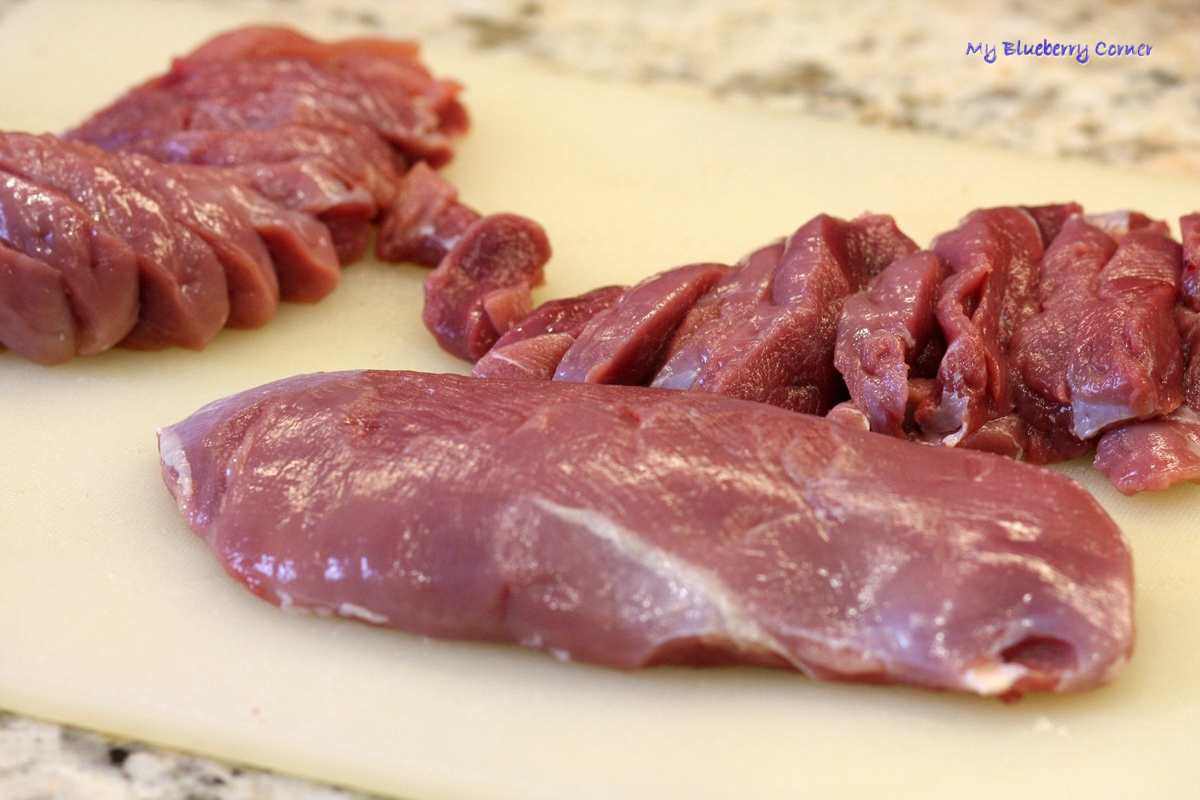 Z kaczych piersi zdjąć skórę (jeśli ją mają) i pokroić w paski.