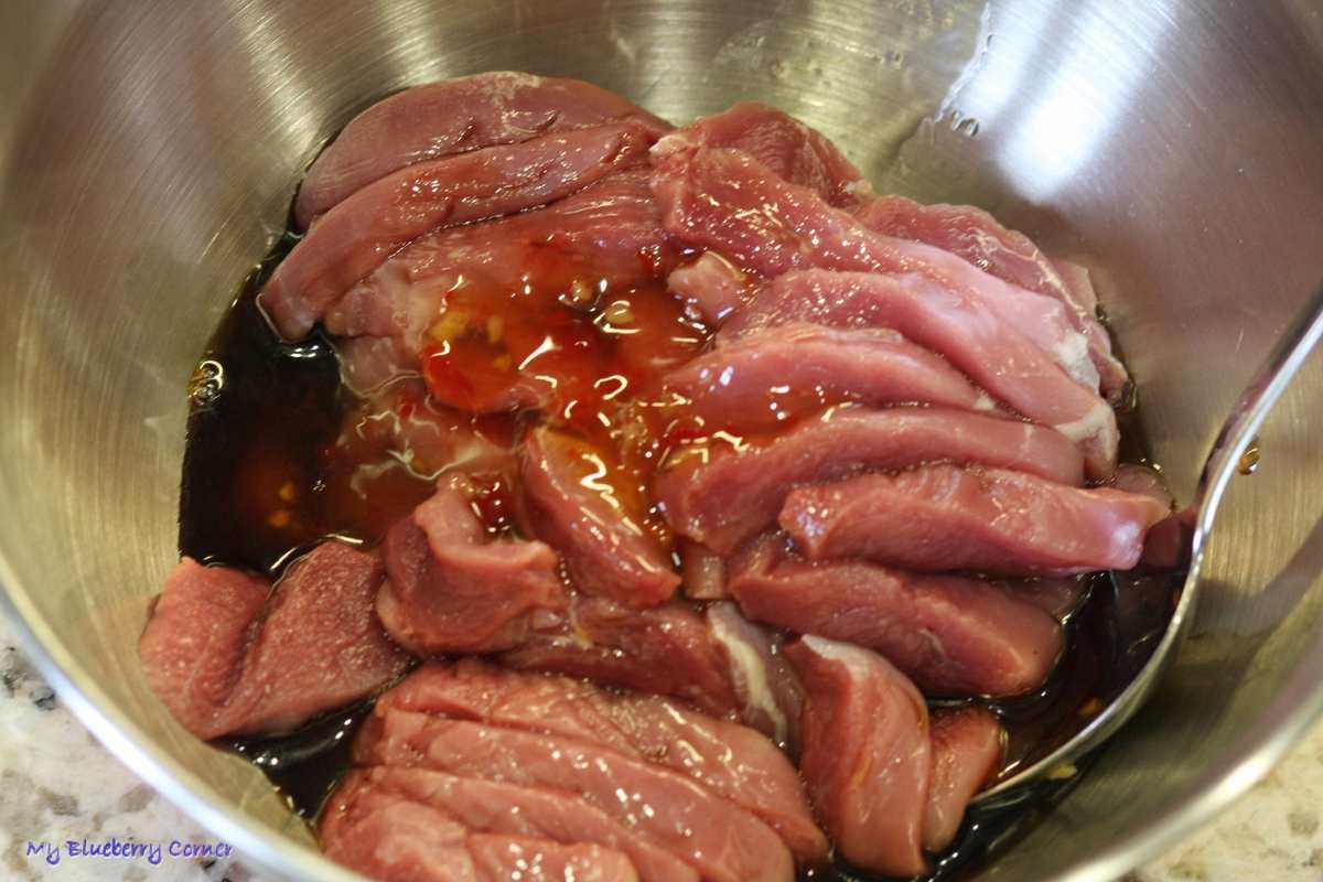 Przełożyć kaczkę do miski, dodać sos sojowy, słodki sos chili i mirin, wymieszać i odstawić na 10 minut.