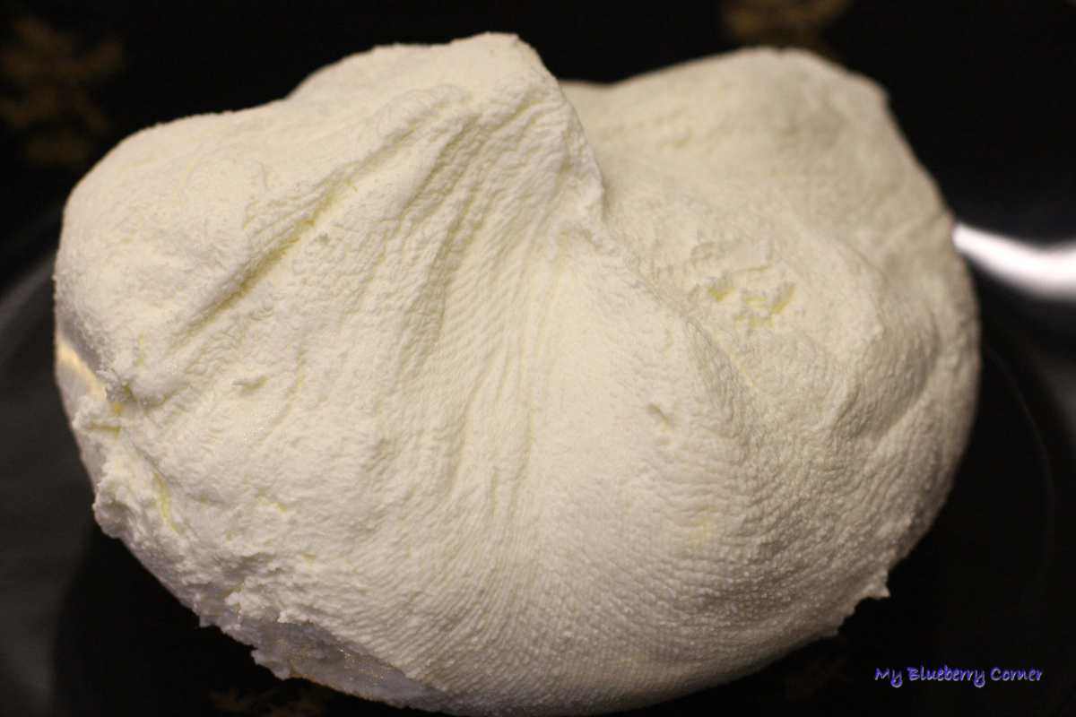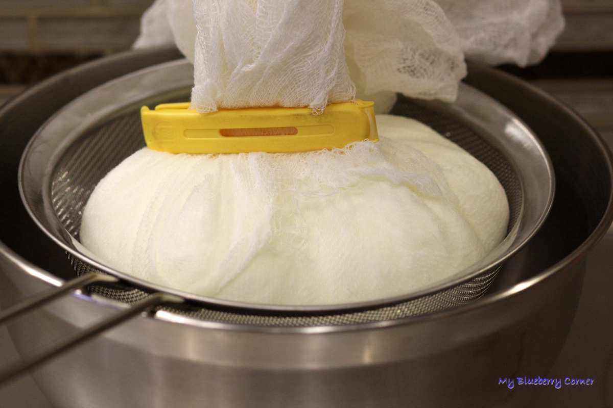 Schować wszystko do lodówki na ok. 3 dni. Po tym czasie paczuszkę z powstałym serkiem zdjąć z sitka i wyjąć z gazy, wylać  odciek (u mnie było go 250 ml).