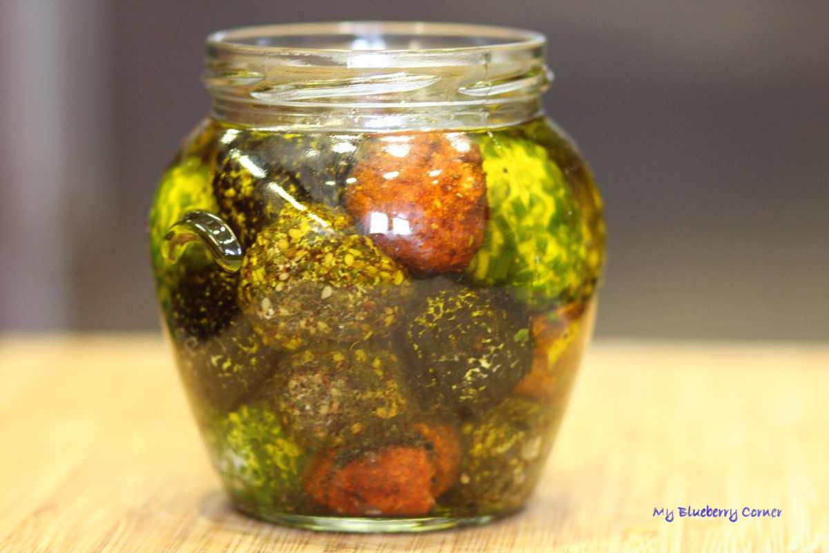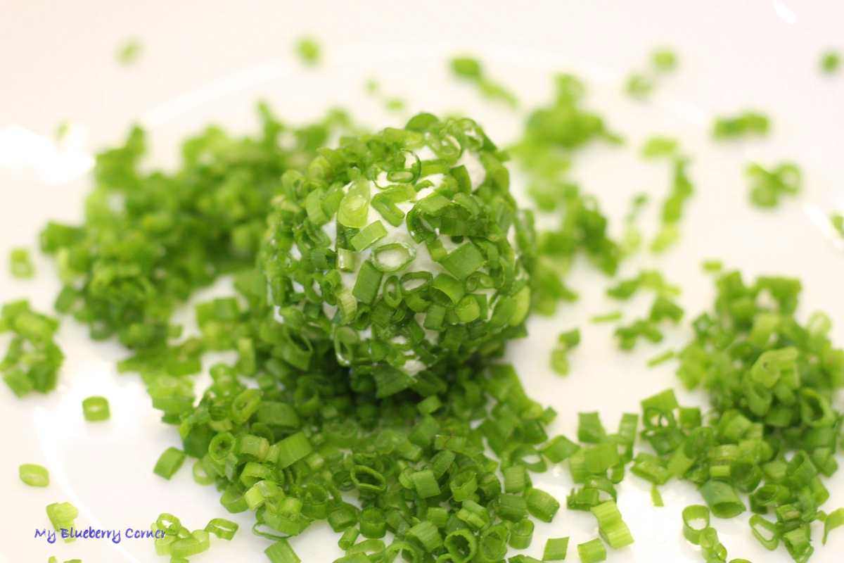 Z części serka uformować kulki, obtoczyć w przyprawach i drobno posiekanym szczypiorku, włożyć do słoika i zalać oliwą z oliwek dobrej jakości.