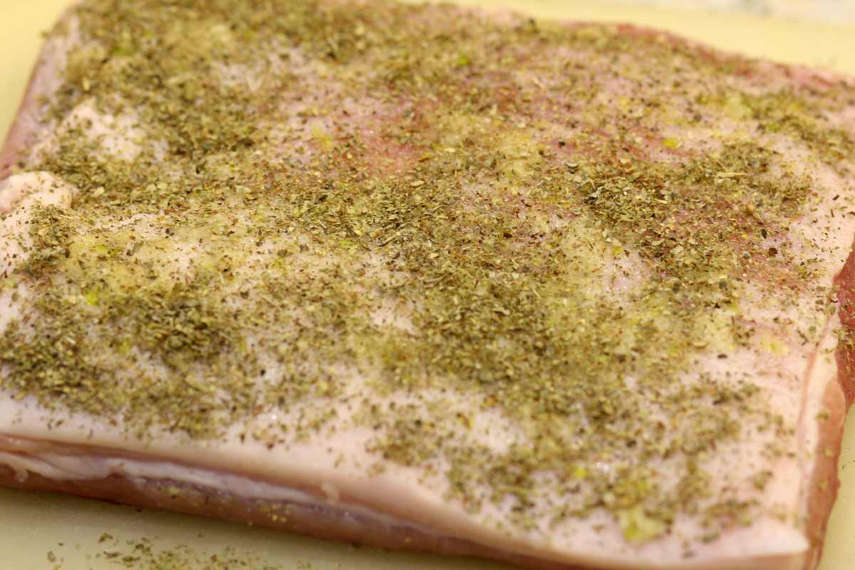 Najpierw od strony skóry posolić, popieprzyć, natrzeć wyciśniętym przez praskę czosnkiem, posypać majerankiem.