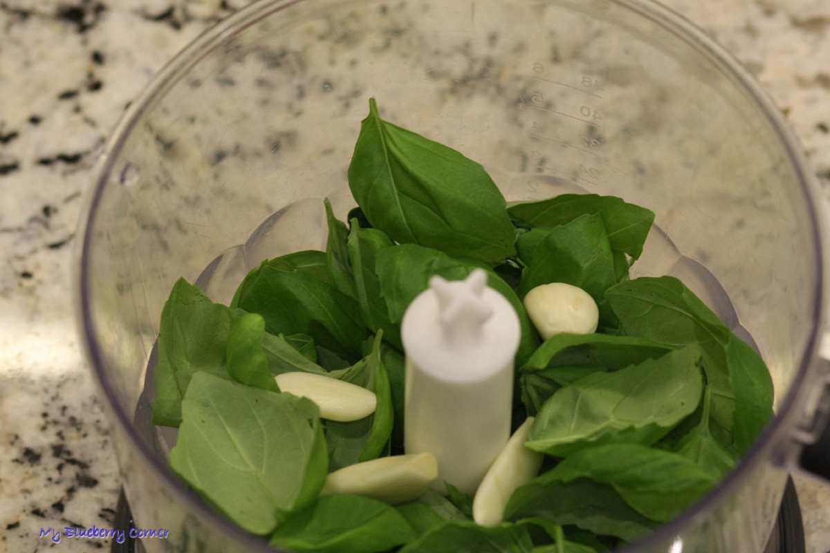 Makaron ugotować al dente, w posolonej wodzie według instrukcji. Czosnek obrać i razem z listkami bazylii zmiksować w blenderze.