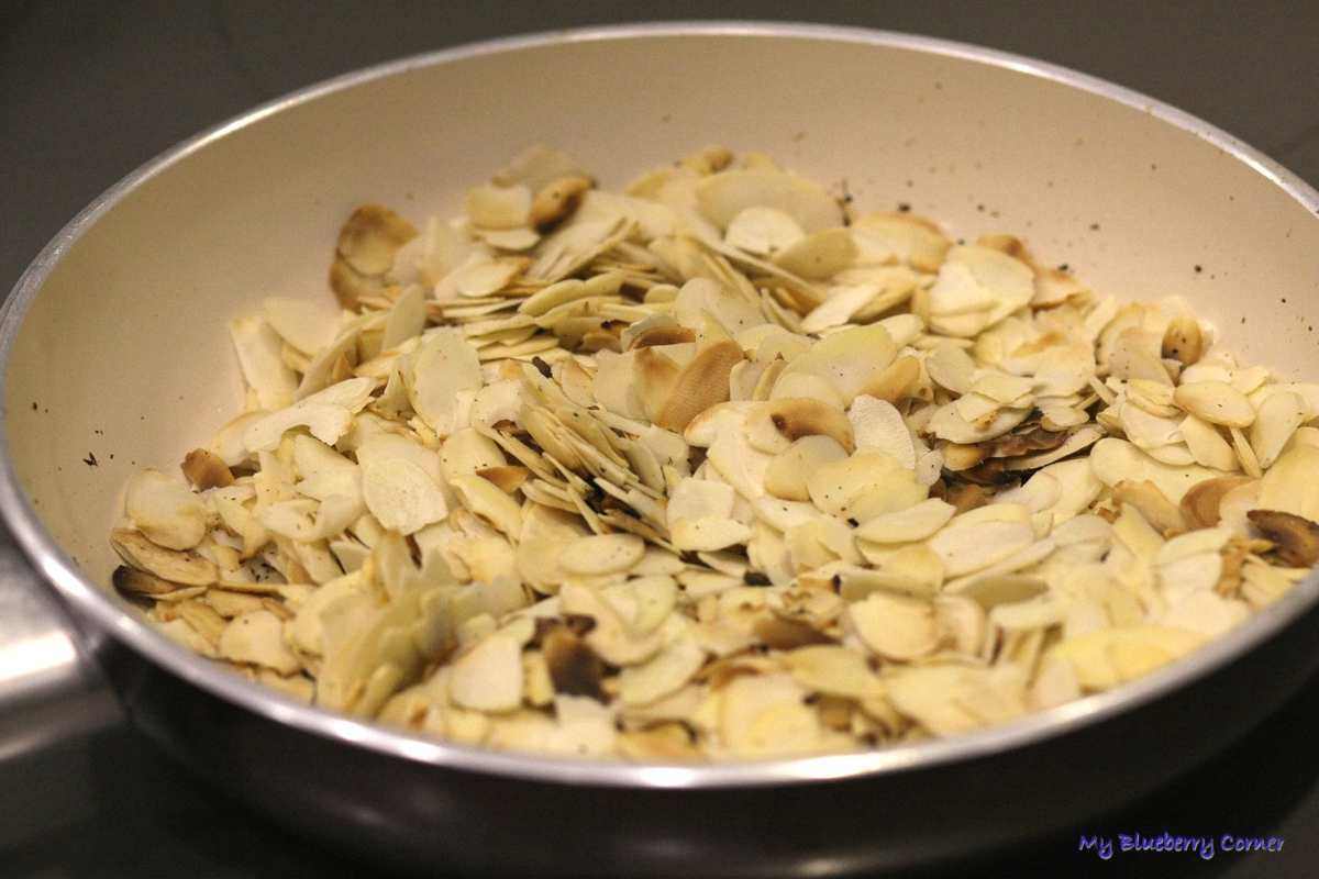Migdały (można użyć migdałowych płatków) uprażyć na suchej, gorącej patelni przez ok. 4-5 minut i wystudzić.