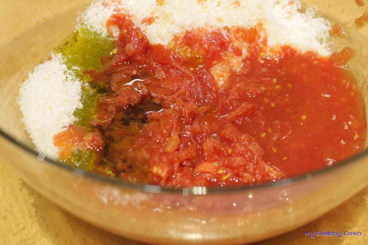 Na końcu dodać sól, pieprz, cukier i sok z cytryny, zamieszać. Parmezan utrzeć do dużej miski, dodać pokrojone lub rozgniecione konserwowe pomidory i oliwę z oliwek.