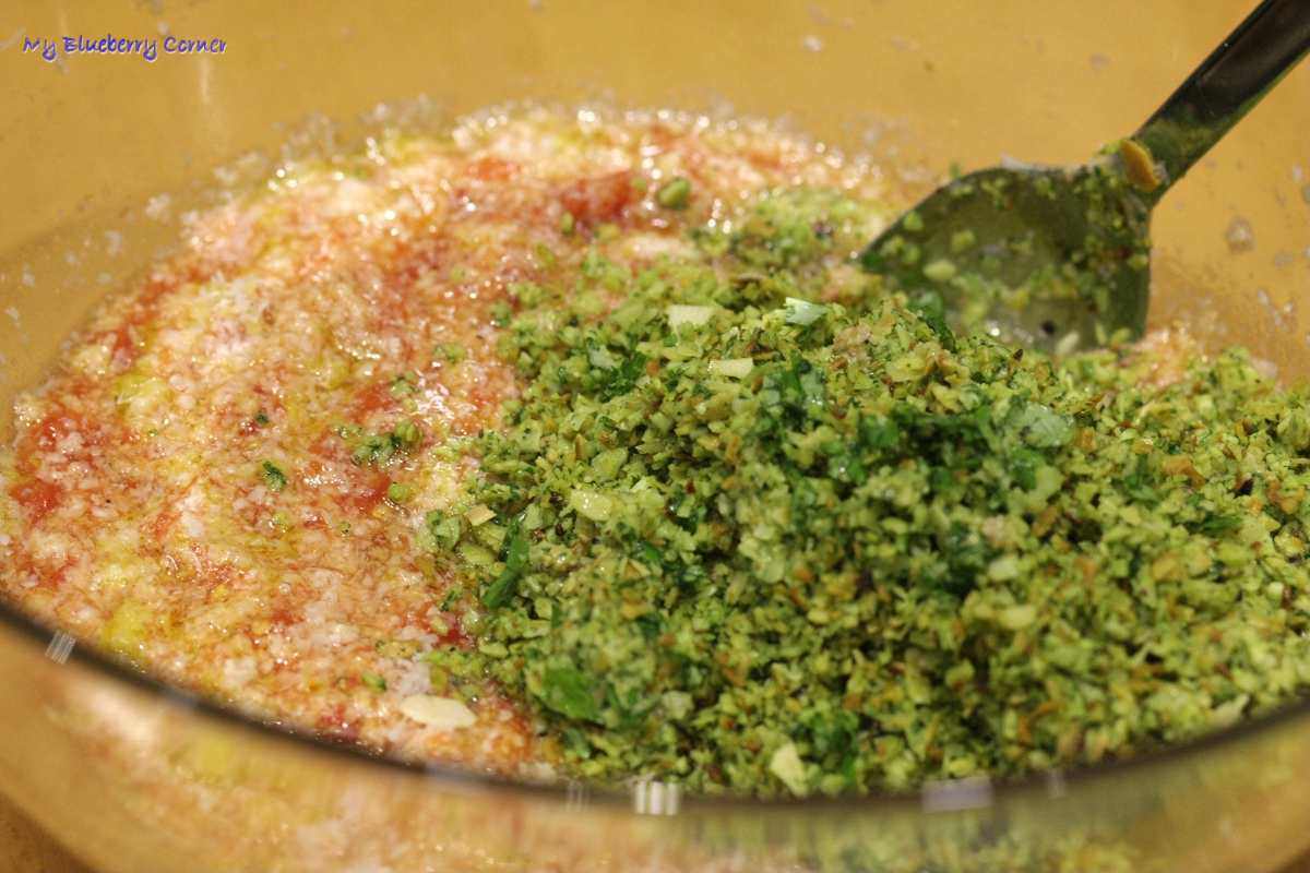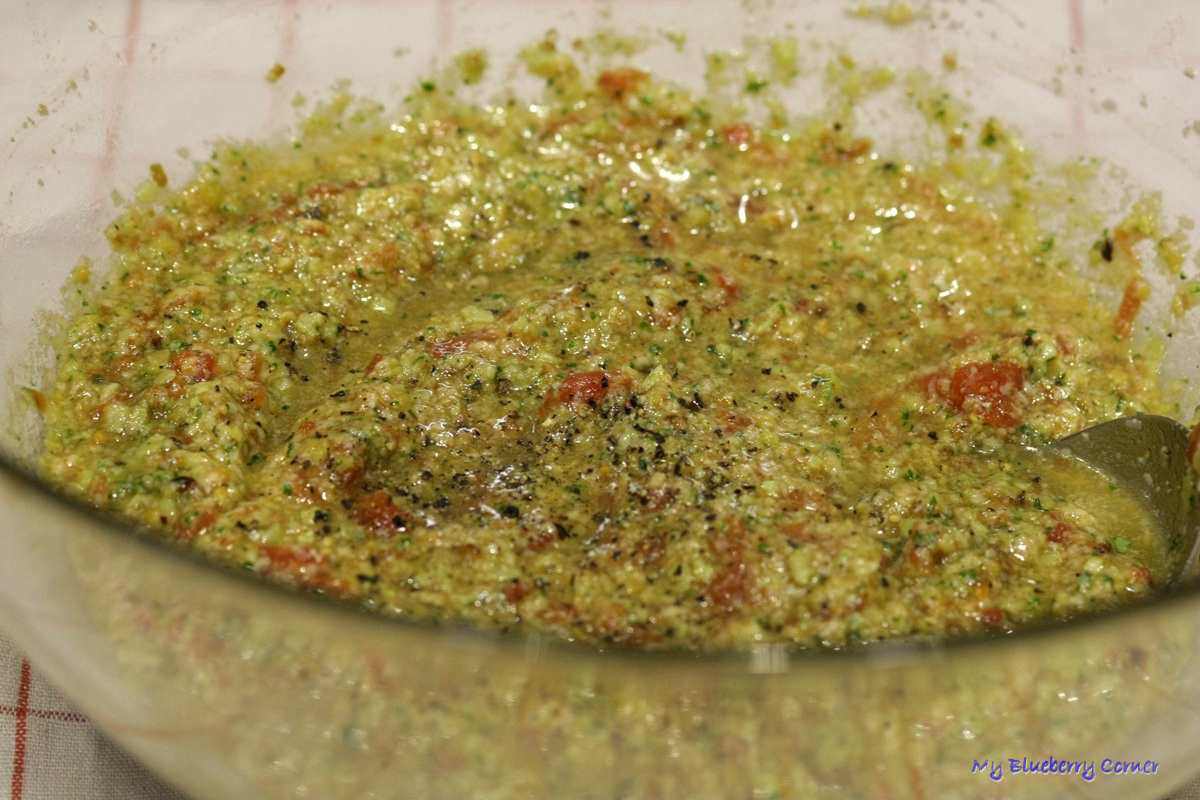 Dodać migdałowo-bazyliową  masę i wymieszać.