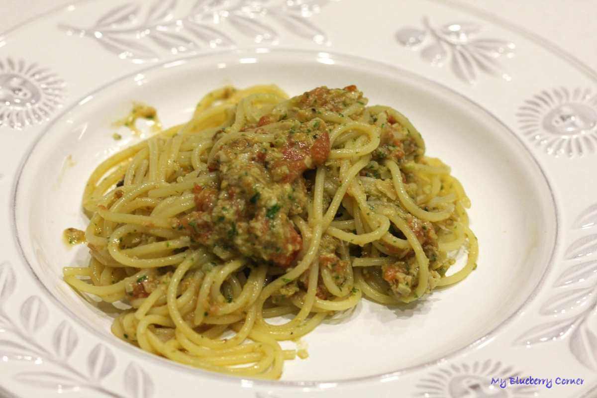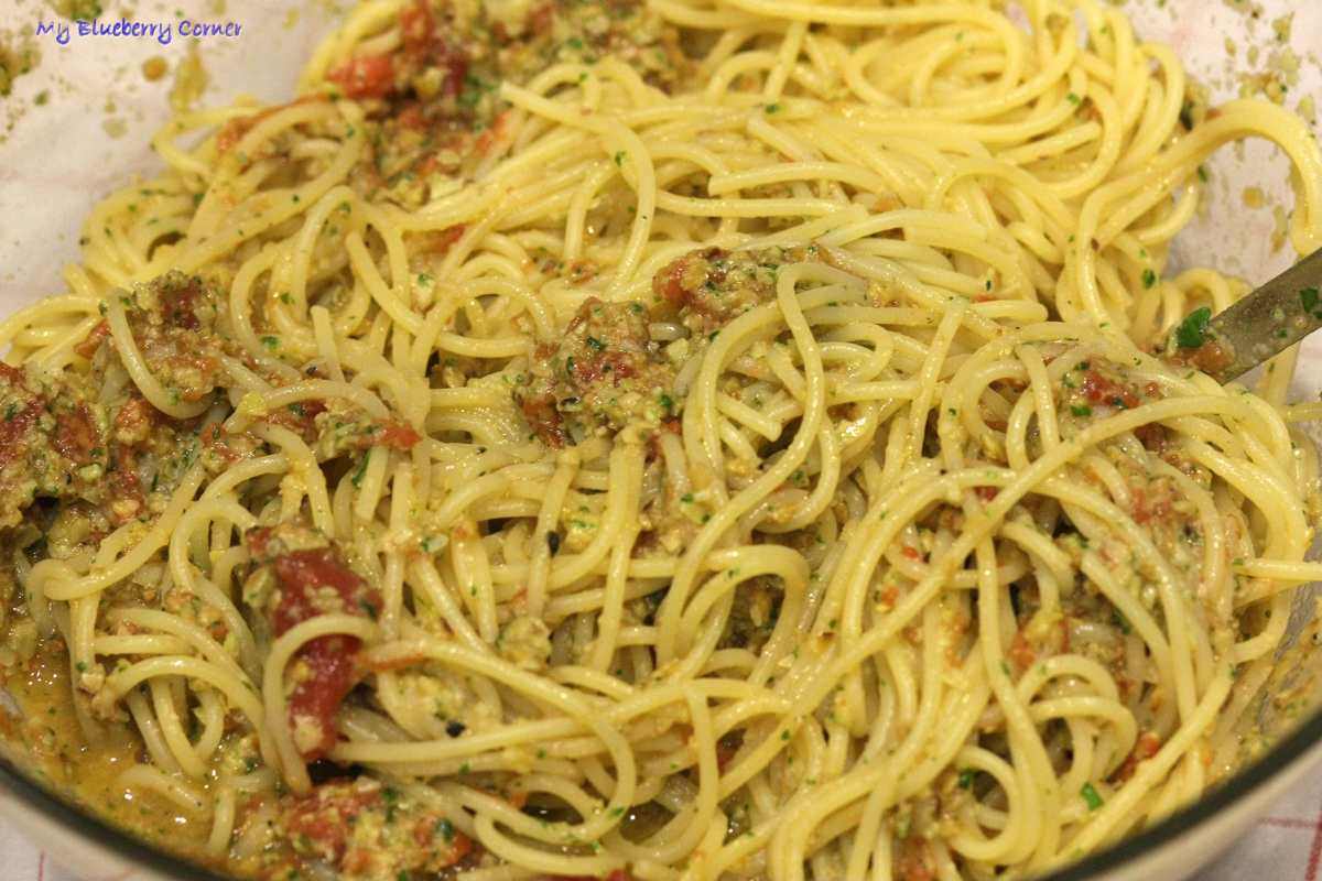 Migdałowe spaghetti (Spaghetti con Pesto alla Trapanese) jest bardzo aromatyczne. Pesto, w którym słodycz migdałów wspaniale komponuje się z kwaśną cytryną i pikantnym czosnkiem, świetnie pasuje do pomidorów, bazylii i sera. Wszystko jemy oczami. To spaghetti jest mega smaczne.