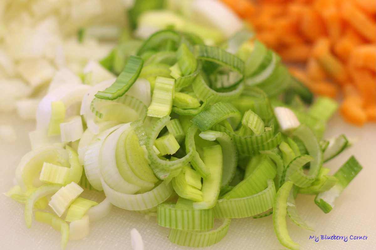 Marchewkę pokroić w słupki, cebulę i czosnek w kostkę. Pora przeciąć wzdłuż na pół, potem na cienkie paski.