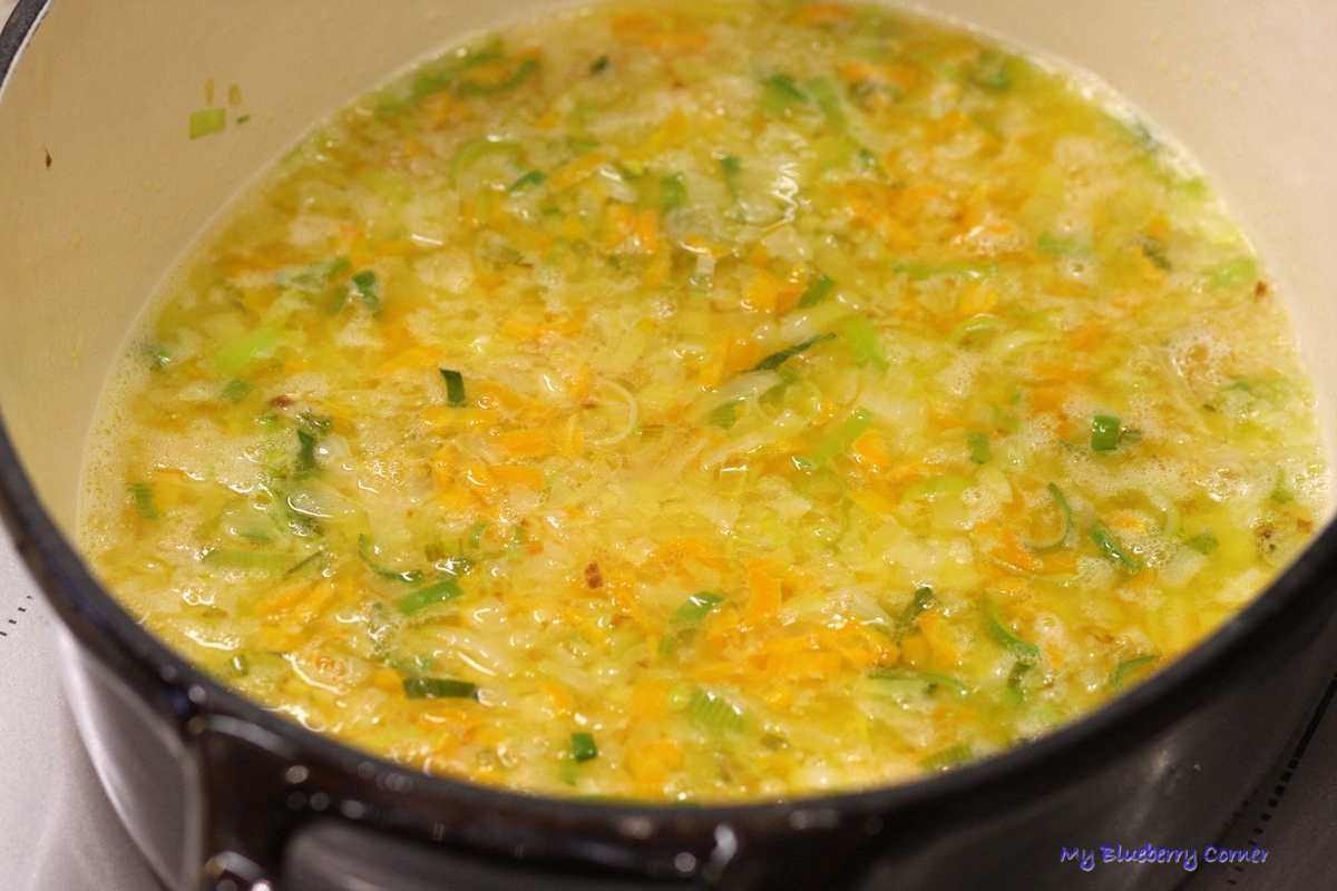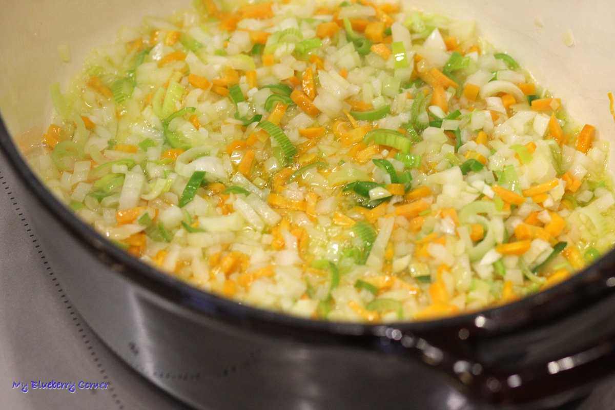W tym czasie, w żeliwnym garnku lub brytfannie rozgrzać masło, wsypać marchewkę, cebulę, czosnek i pora.