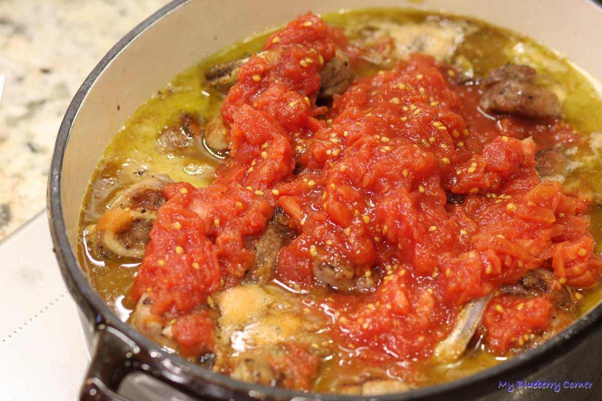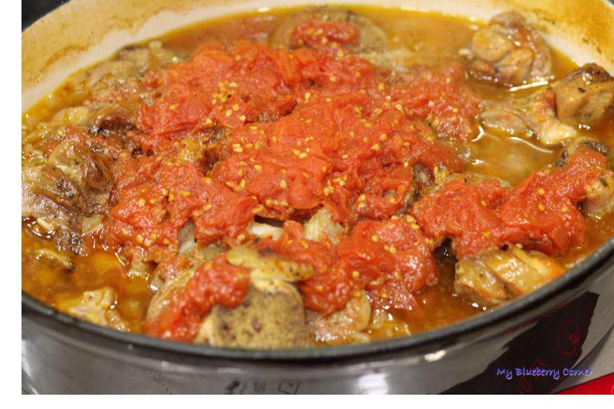 Świeże pomidory sparzyć, zdjąć skórę i posiekać w kostkę, te ze słoika pokroić. Na dużej patelni rozgrzać oliwę z oliwek, włożyć mięso i usmażyć z dwóch stron na rumiano.