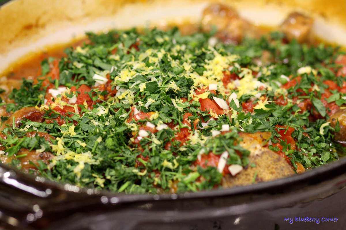 Garnek przykryć i wstawić do piekarnika na 1½ godziny. Przygotować składniki gremolaty. Listki natki posiekać, czosnek pokroić w drobną kosteczkę. Wyjąć garnek z piekarnika, zdjąć pokrywkę, posypać gremolatą i podawać.