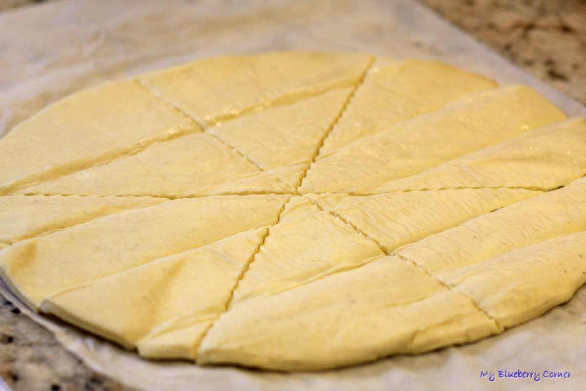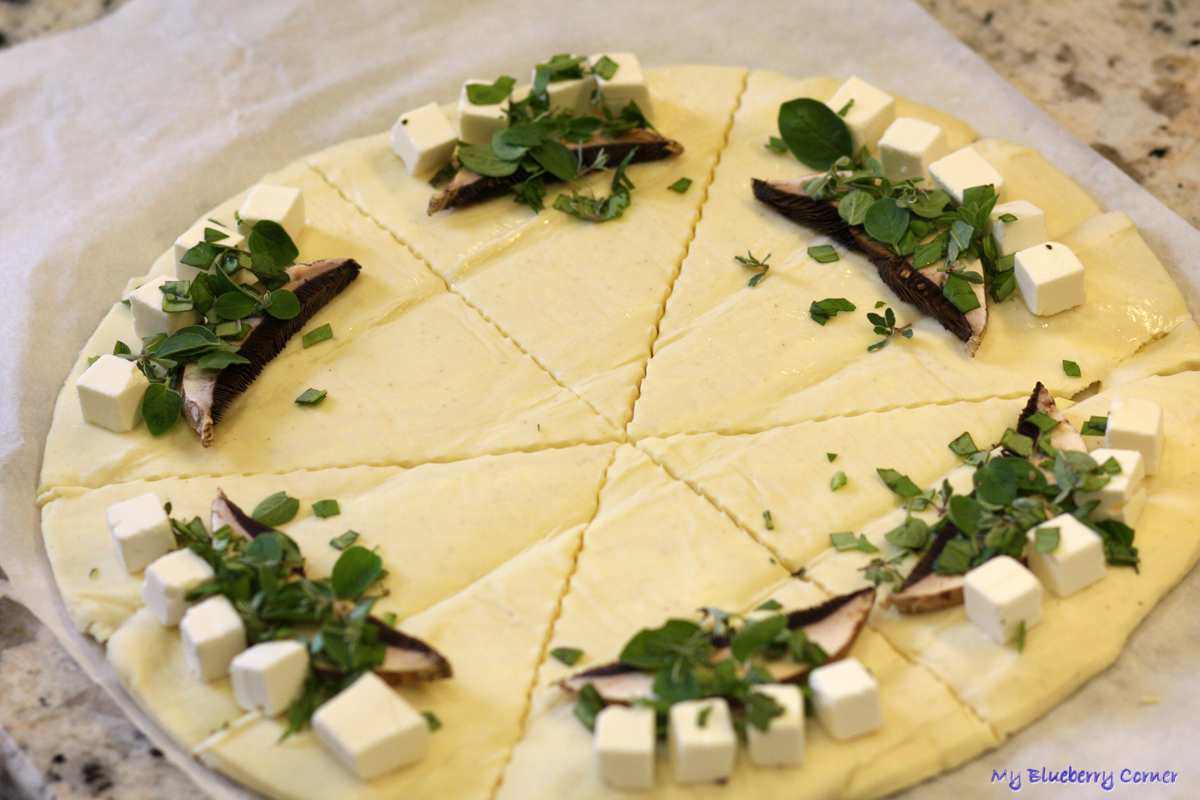 Piekarnik rozgrzać do temperatury 190°C w termoobiegu. Ciasto na croissanty wyjąć z lodówki. Pudełko z serem otworzyć, wyjąć sitko z zawartością, żeby odciekła zalewa. Pieczarkę pokroić na drobniejsze kawałki. Ciasto wyjąć z opakowania i rozwinąć na płasko. Radełkiem lub nożem pokroić na 6 części (jak na zdjęciu).
