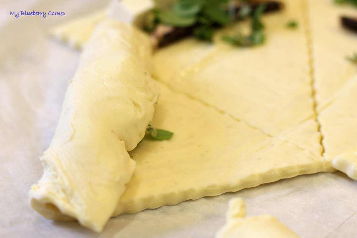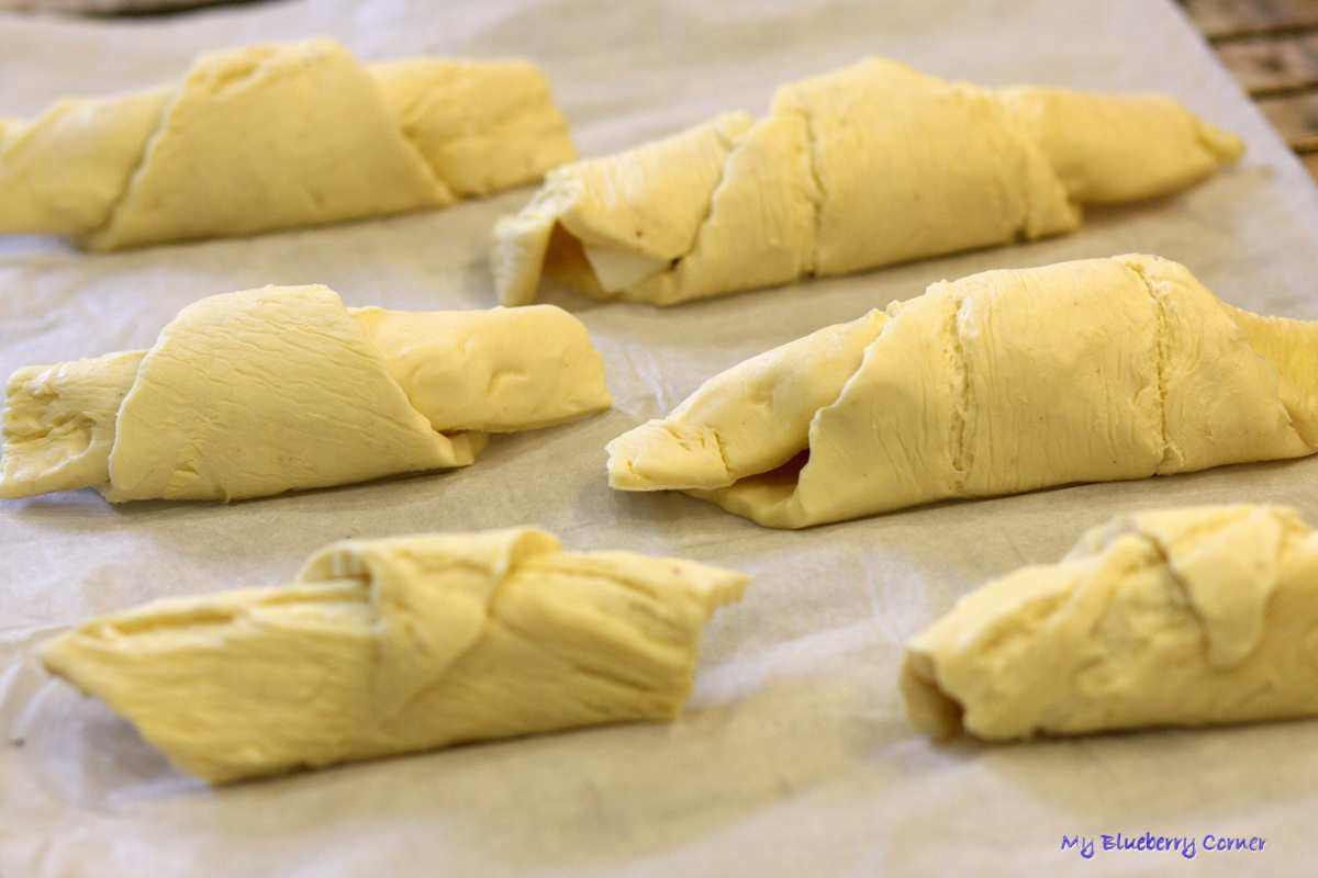 Zwinąć rogaliki, zaczynając od dłuższego boku z nadzieniem.
