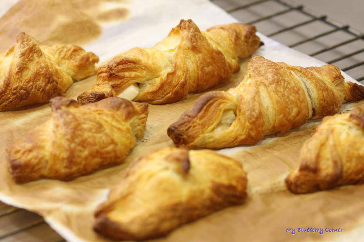 Papier ze zwiniętymi croissantami przełożyć na drucianą blachę, wstawić do gorącego piekarnika i piec przez 20 minut.