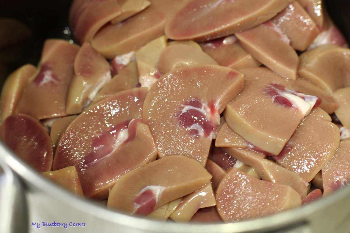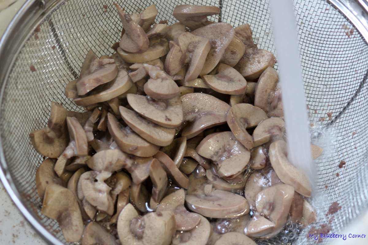 Oczyszczone nerki zalać zimną wodą i odstawić na 2-3 godziny (kilka razy zmienić wodę). Po tym czasie nerki wyjąć, przeciąć wzdłuż na pół i pokroić w cienkie półplasterki.