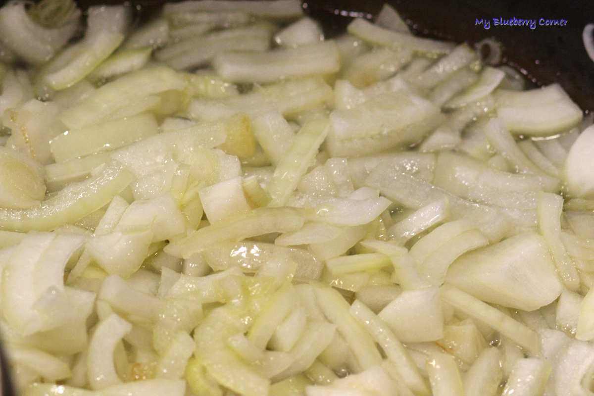 Cebulę obrać i pokroić na średnie kawałki, podsmażyć na 1 łyżce oliwy z oliwek.
