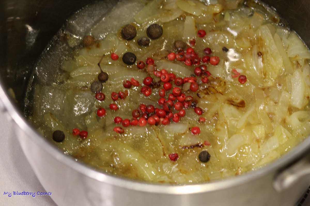 W garnku zagotować rosół, dodać cebulę, ziele angielskie i czerwony pieprz, zmniejszyć temperaturę i dusić przez ok. 10 minut.
