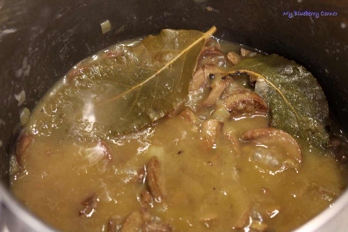 Z garnka wyłowić przyprawy, zostawiając kilka ziarenek czerwonego pieprzu, wszystko lekko zblendować, tak żeby pozostały kawałki cebuli. Dodać podsmażone nerki, liście laurowe i gotować przez ok. 20 minut (do miękkości).