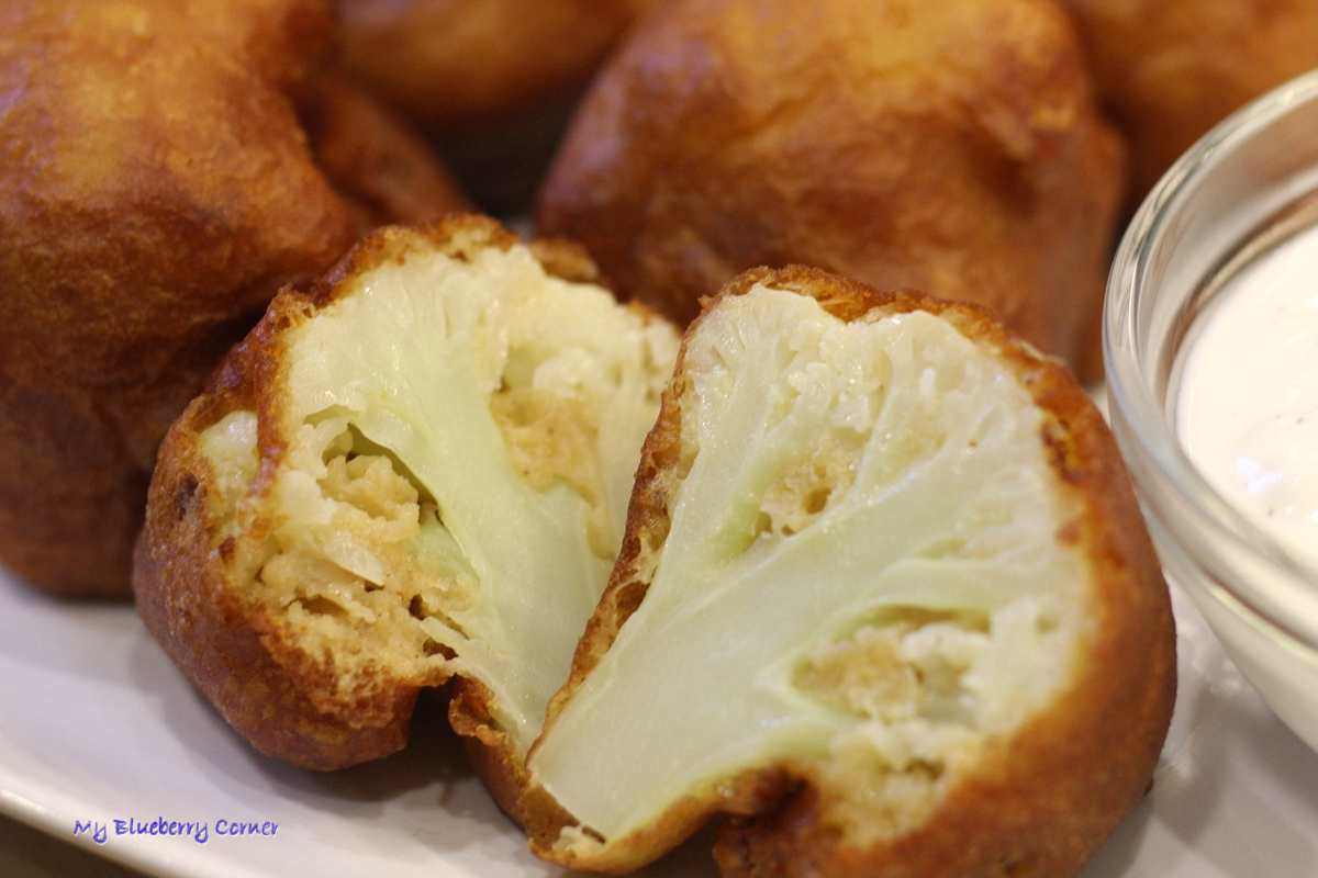 Gorący kalafior w cieście doskonale smakuje z zimnym jogurtowym dipem.