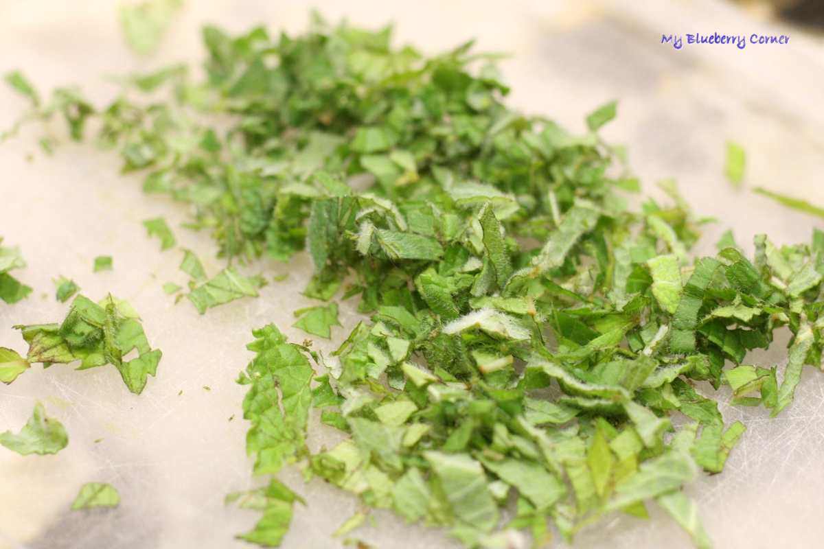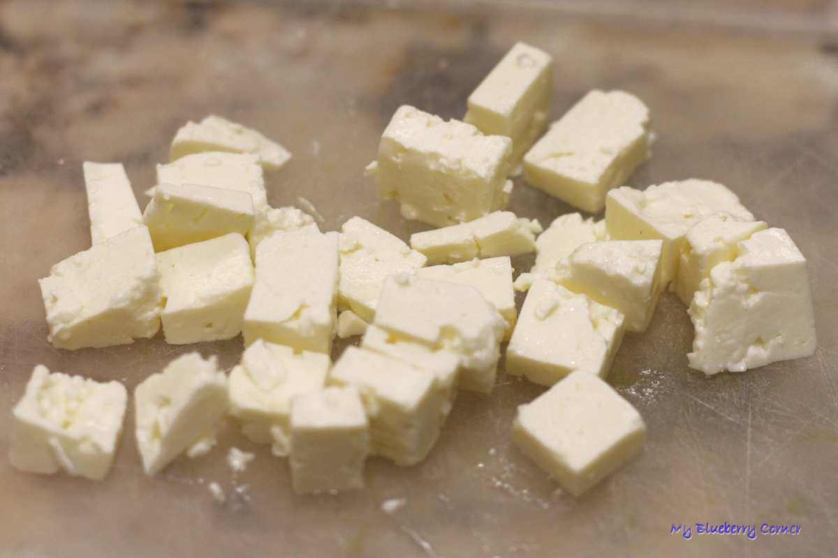 Fetę podrobić i wymieszać razem z parmezanem i pokrojoną miętą.