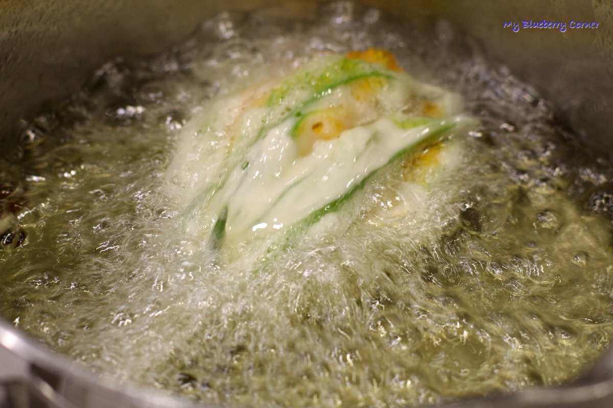 Przy pomocy metalowej rózgi rozmieszać ciasto o gęstości naleśnikowego. W garnku o średnicy większej, niż długość naszych kwiatów rozgrzać olej (ok. 3 cm wysokości). Sprawdzić, czy olej jest odpowiednio gorący – najlepiej zrobić test kroplą ciasta, gdy od razu wypłynie olej jest odpowiednio gorący, gdy olej zaczyna dymić, jest za gorący. Napełnione nadzieniem kwiaty obtoczyć w cieście, pozwalając spłynąć nadmiarowi ciasta.