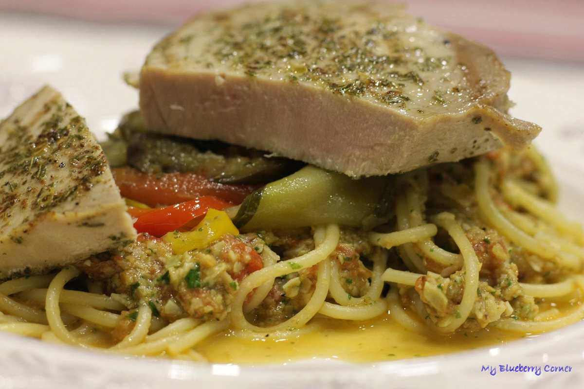 Stek z tuńczyka przygotowuje się podobnie do wołowego steka, ale rybny stek jest oczywiście zdrowszy. Stek z tuńczyka po usmażeniu powinien być różowy w środku. Tuńczyk zawiera kwasy omega-3. Kwasy omega-3 wykazują działanie przeciwzapalne, dzięki czemu są wykorzystywane w leczeniu i profilaktyce wielu różnych chorób. Tuńczyk to również bogate źródło witaminy A, D oraz witamin z grupy B. Mają one bardzo dobry wpływ na wygląd skóry, na wzrok oraz na produkcję czerwonych krwinek. Stek z tuńczyka do doskonała potrawa, a w połączeniu z migdałowym spaghetti i warzywnym ratatouille to niebo w gębie.