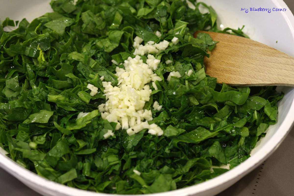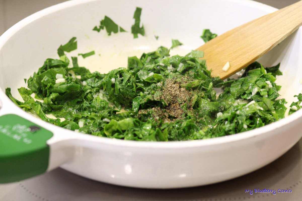 Czosnek obrać, pokroić w kosteczkę. Na patelni rozgrzać oliwę z oliwek, wrzucić szpinak i czosnek, dodać szczyptę soli i cały pieprz i smażyć przez 10 minut.