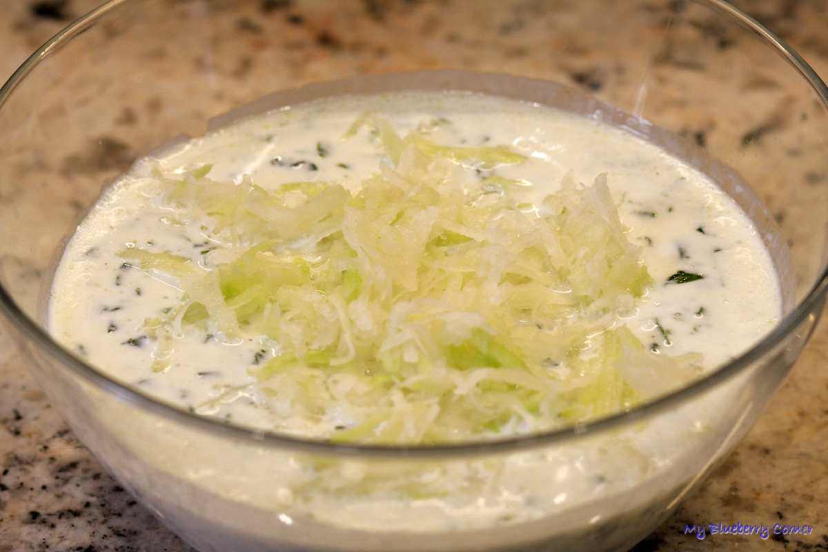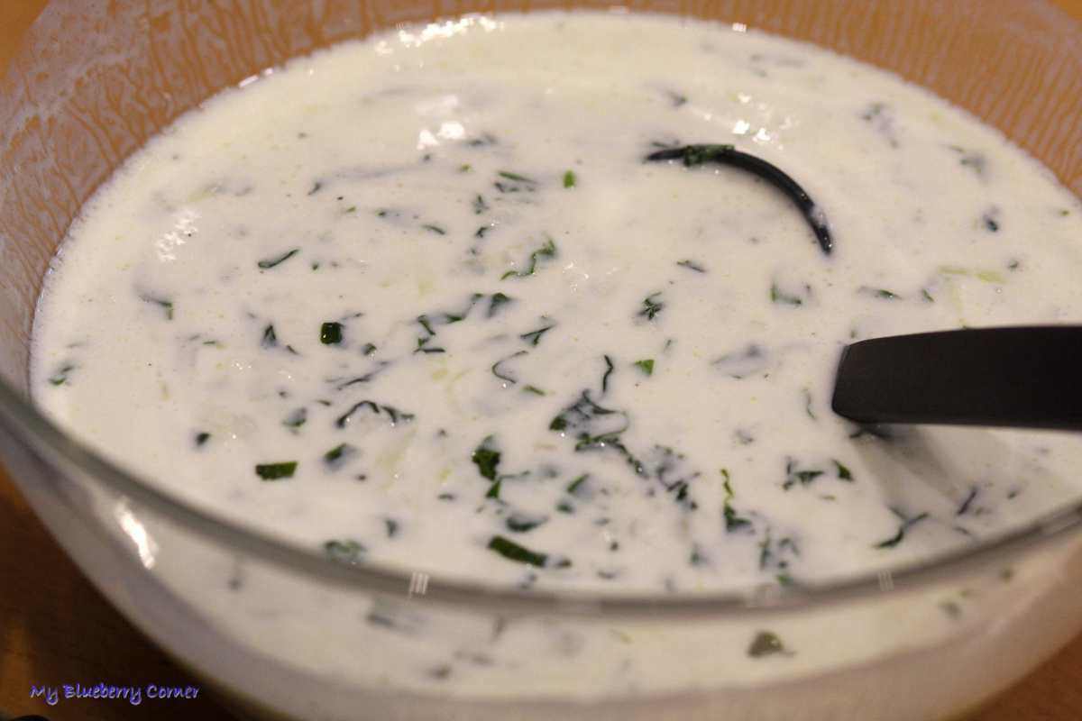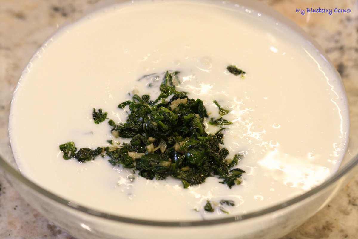 Koperek pokroić. Do salaterki lub garnka wlać kefir, dodać szpinak.