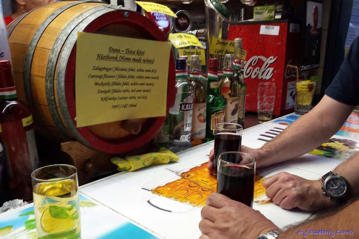 Na piętrze można kupić obrusy – całą masę obrusów, koszulki i pamiątki, można też dobrze zjeść, ale najpierw należy się porządnie rozejrzeć, żeby nie kupić starej, „wczorajszej” kiełbasy czy kaszanki – siedząc naprzeciwko stoisk z jedzeniem, można się napatrzeć, jak sprzedawcy „malują olejem” te wyschnięte kiełbasy, żeby lepiej się prezentowały. Jest tu mnóstwo stoisk z tanim jedzeniem, napojami wszelkiego rodzaju. To tu piłam pyszne białe wino Muskotály i czerwone Kékfrankos – obydwa w wyjątkowo niskiej cenie 70 forintów za 100 ml.