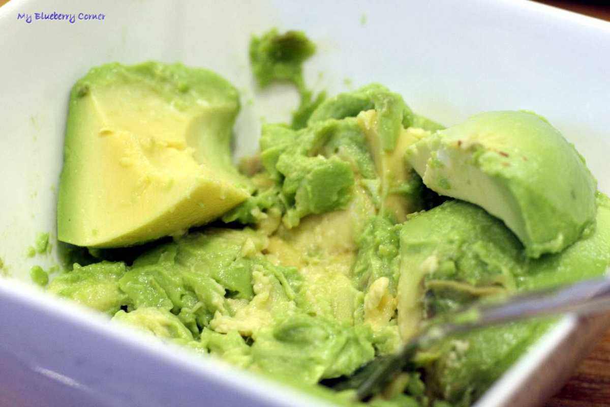 Awokado przekroić na 2 połówki, usunąć pestkę. Łyżką wyjąć miąższ z łupiny i rozgnieść widelcem.